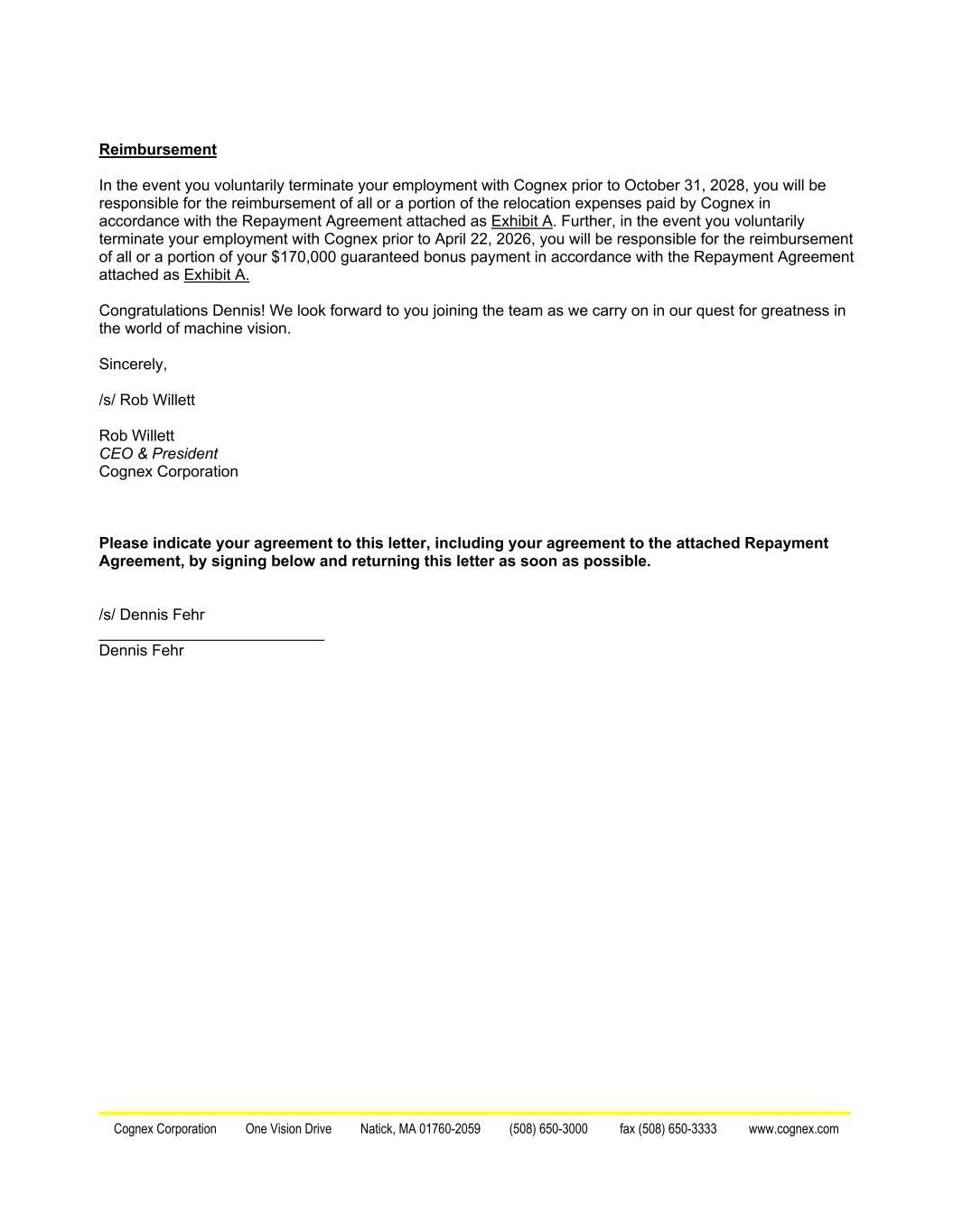 Cognex Corporation One Vision Drive Natick, MA 01760-2059 (508) 650-3000 fax (508) 650-3333 www.cognex.com Reimbursement In the event you voluntarily terminate your employment with Cognex prior to October 31, 2028, you will be responsible for the reimbursement of all or a portion of the relocation expenses paid by Cognex in accordance with the Repayment Agreement attached as Exhibit A. Further, in the event you voluntarily terminate your employment with Cognex prior to April 22, 2026, you will be responsible for the reimbursement of all or a portion of your $170,000 guaranteed bonus payment in accordance with the Repayment Agreement attached as Exhibit A. Congratulations Dennis! We look forward to you joining the team as we carry on in our quest for greatness in the world of machine vision. Sincerely, /s/ Rob Willett Rob Willett CEO & President Cognex Corporation Please indicate your agreement to this letter, including your agreement to the attached Repayment Agreement, by signing below and returning this letter as soon as possible. /s/ Dennis Fehr __________________________ Dennis Fehr