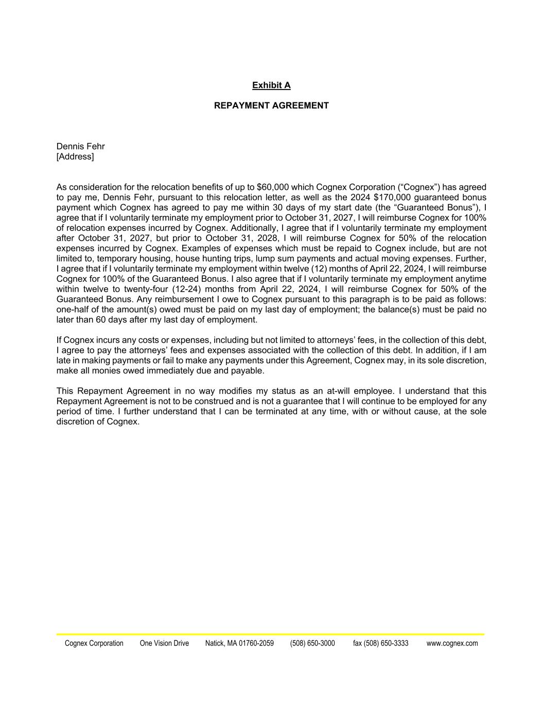 Cognex Corporation One Vision Drive Natick, MA 01760-2059 (508) 650-3000 fax (508) 650-3333 www.cognex.com Exhibit A REPAYMENT AGREEMENT Dennis Fehr [Address] As consideration for the relocation benefits of up to $60,000 which Cognex Corporation (“Cognex”) has agreed to pay me, Dennis Fehr, pursuant to this relocation letter, as well as the 2024 $170,000 guaranteed bonus payment which Cognex has agreed to pay me within 30 days of my start date (the “Guaranteed Bonus”), I agree that if I voluntarily terminate my employment prior to October 31, 2027, I will reimburse Cognex for 100% of relocation expenses incurred by Cognex. Additionally, I agree that if I voluntarily terminate my employment after October 31, 2027, but prior to October 31, 2028, I will reimburse Cognex for 50% of the relocation expenses incurred by Cognex. Examples of expenses which must be repaid to Cognex include, but are not limited to, temporary housing, house hunting trips, lump sum payments and actual moving expenses. Further, I agree that if I voluntarily terminate my employment within twelve (12) months of April 22, 2024, I will reimburse Cognex for 100% of the Guaranteed Bonus. I also agree that if I voluntarily terminate my employment anytime within twelve to twenty-four (12-24) months from April 22, 2024, I will reimburse Cognex for 50% of the Guaranteed Bonus. Any reimbursement I owe to Cognex pursuant to this paragraph is to be paid as follows: one-half of the amount(s) owed must be paid on my last day of employment; the balance(s) must be paid no later than 60 days after my last day of employment. If Cognex incurs any costs or expenses, including but not limited to attorneys’ fees, in the collection of this debt, I agree to pay the attorneys’ fees and expenses associated with the collection of this debt. In addition, if I am late in making payments or fail to make any payments under this Agreement, Cognex may, in its sole discretion, make all monies owed immediately due and payable. This Repayment Agreement in no way modifies my status as an at-will employee. I understand that this Repayment Agreement is not to be construed and is not a guarantee that I will continue to be employed for any period of time. I further understand that I can be terminated at any time, with or without cause, at the sole discretion of Cognex.
