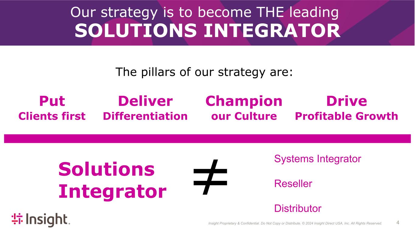 Insight Proprietary & Confidential. Do Not Copy or Distribute. © 2022 Insight Direct USA, Inc. All Rights Reserved. 44 Put clients first We put our clients first, delivering essential value that contributes to their success and making us the partner they can't live without. Deliver differentiation Our combination of innovative and scalable solutions, exceptional talent and unique portfolio strategy gives us a differentiated advantage. Champion culture Our teammates and our culture are our biggest assets. We champion them to deliver the best. Put Clients first Deliver Differentiation Champion our Culture Drive Profitable Growth Solutions Int grator ≠ Systems Integrator Reseller Distributor Our strategy is to become THE leading SOLUTIONS INTEGRATOR The pillars of our strategy are: