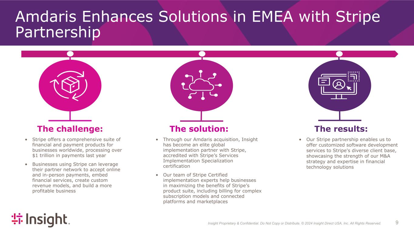 Insight Proprietary & Confidential. Do Not Copy or Distribute. © 2022 Insight Direct USA, Inc. All Rights Reserved. 94 Amdaris Enhances Solutions in EMEA with Stripe Partnership The challenge: The results: • Stripe offers a comprehensive suite of financial and payment products for businesses worldwide, processing over $1 trillion in payments last year • Businesses using Stripe can leverage their partner network to accept online and in-person payments, embed financial services, create custom revenue models, and build a more profitable business • Our Stripe partnership enables us to offer customized software development services to Stripe's diverse client base, showcasing the strength of our M&A strategy and expertise in financial technology solutions The solution: • Through our Amdaris acquisition, Insight has become an elite global implementation partner with Stripe, accredited with Stripe’s Services Implementation Specialization certification • Our team of Stripe Certified implementation experts help businesses in maximizing the benefits of Stripe’s product suite, including billing for complex subscription models and connected platforms and marketplaces
