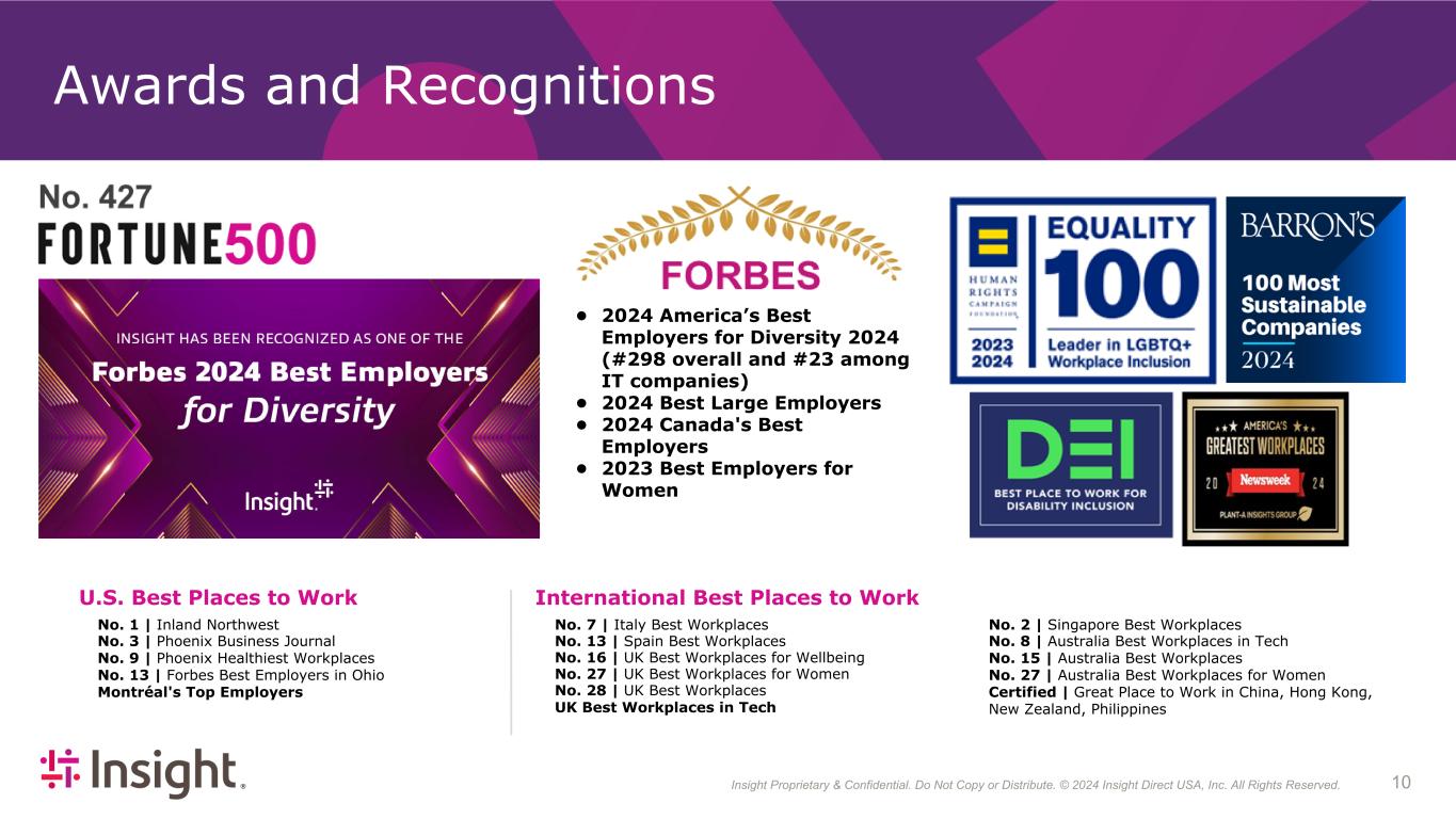 Insight Proprietary & Confidential. Do Not Copy or Distribute. © 2022 Insight Direct USA, Inc. All Rights Reserved. 104 • 2024 America’s Best Employers for Diversity 2024 (#298 overall and #23 among IT companies) • 2024 Best Large Employers • 2024 Canada's Best Employers • 2023 Best Employers for Women Awards and Recognitions U.S. Best Places to Work International Best Places to Work No. 1 | Inland Northwest No. 3 | Phoenix Business Journal No. 9 | Phoenix Healthiest Workplaces No. 13 | Forbes Best Employers in Ohio Montréal's Top Employers No. 7 | Italy Best Workplaces No. 13 | Spain Best Workplaces No. 16 | UK Best Workplaces for Wellbeing No. 27 | UK Best Workplaces for Women No. 28 | UK Best Workplaces UK Best Workplaces in Tech No. 2 | Singapore Best Workplaces No. 8 | Australia Best Workplaces in Tech No. 15 | Australia Best Workplaces No. 27 | Australia Best Workplaces for Women Certified | Great Place to Work in China, Hong Kong, New Zealand, Philippines