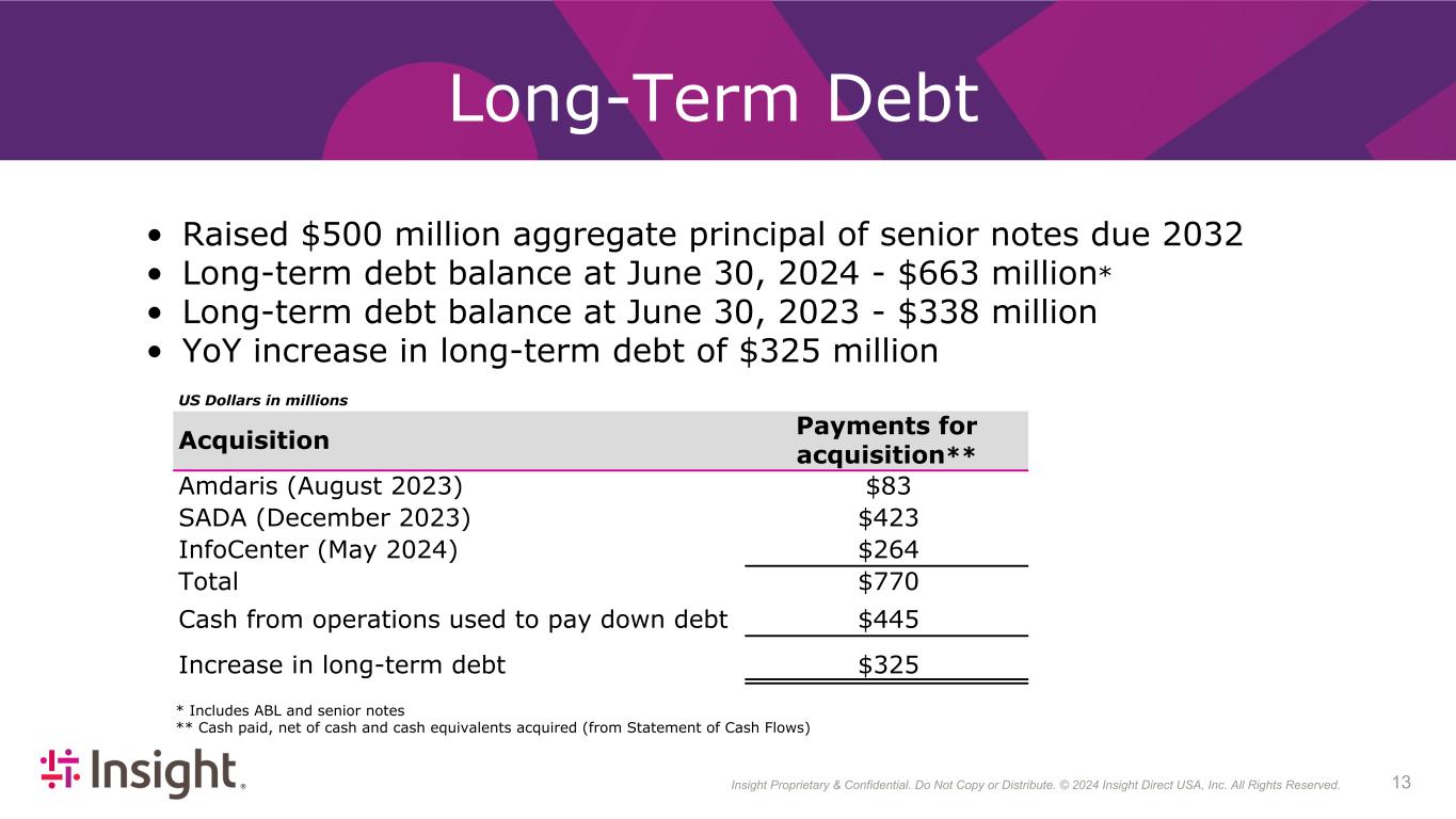 Insight Proprietary & Confidential. Do Not Copy or Distribute. © 2022 Insight Direct USA, Inc. All Rights Reserved. 134 Long-Term Debt US Dollars in millions Acquisition Payments for acquisition** Amdaris (August 2023) $83 SADA (December 2023) $423 InfoCenter (May 2024) $264 Total $770 Cash from operations used to pay down debt $445 Increase in long-term debt $325 • Raised $500 million aggregate principal of senior notes due 2032 • Long-term debt balance at June 30, 2024 - $663 million* • Long-term debt balance at June 30, 2023 - $338 million • YoY increase in long-term debt of $325 million * Includes ABL and senior notes ** Cash paid, net of cash and cash equivalents acquired (from Statement of Cash Flows)