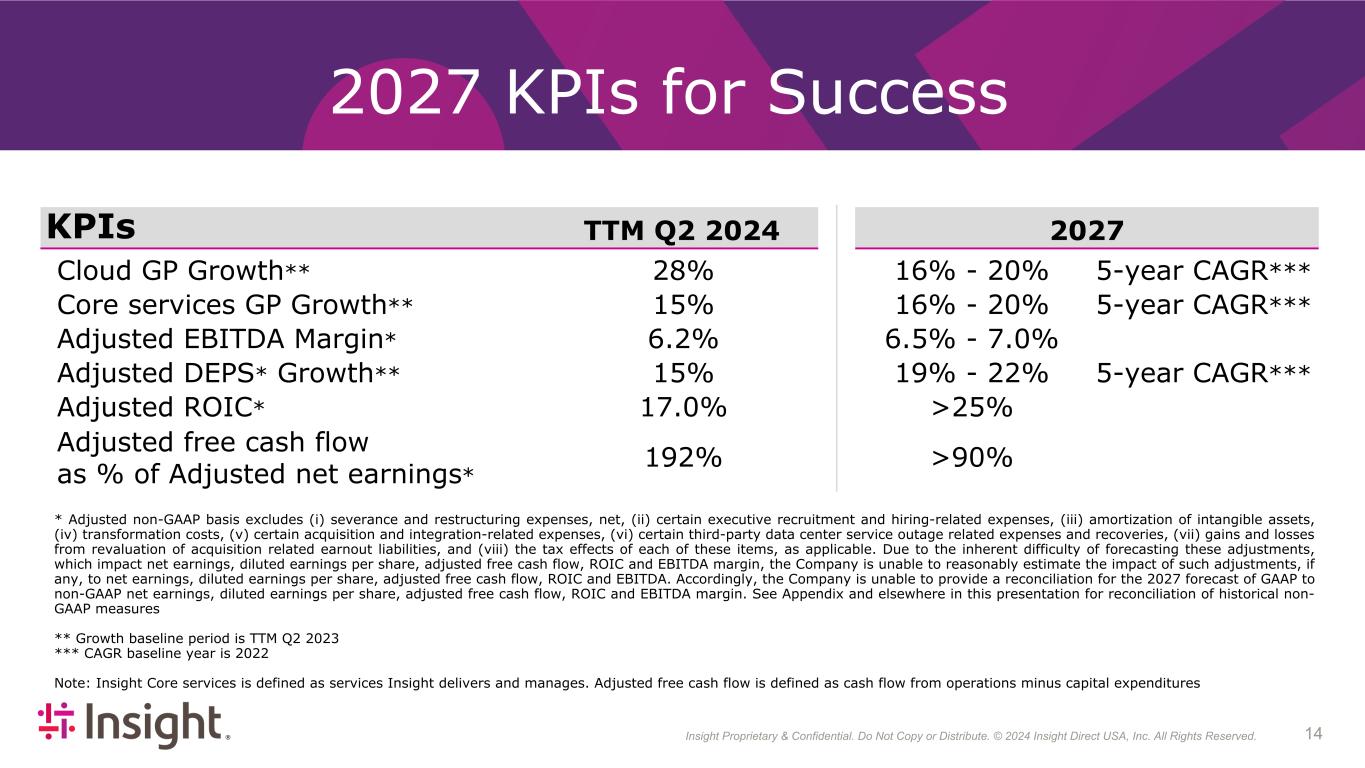 Insight Proprietary & Confidential. Do Not Copy or Distribute. © 2022 Insight Direct USA, Inc. All Rights Reserved. 144 2027 KPIs for Success KPIs TTM Q2 2024 2027 Cloud GP Growth** 28% 16% - 20% 5-year CAGR*** Core services GP Growth** 15% 16% - 20% 5-year CAGR*** Adjusted EBITDA Margin* 6.2% 6.5% - 7.0% Adjusted DEPS* Growth** 15% 19% - 22% 5-year CAGR*** Adjusted ROIC* 17.0% >25% Adjusted free cash flow as % of Adjusted net earnings* 192% >90% * Adjusted non-GAAP basis excludes (i) severance and restructuring expenses, net, (ii) certain executive recruitment and hiring-related expenses, (iii) amortization of intangible assets, (iv) transformation costs, (v) certain acquisition and integration-related expenses, (vi) certain third-party data center service outage related expenses and recoveries, (vii) gains and losses from revaluation of acquisition related earnout liabilities, and (viii) the tax effects of each of these items, as applicable. Due to the inherent difficulty of forecasting these adjustments, which impact net earnings, diluted earnings per share, adjusted free cash flow, ROIC and EBITDA margin, the Company is unable to reasonably estimate the impact of such adjustments, if any, to net earnings, diluted earnings per share, adjusted free cash flow, ROIC and EBITDA. Accordingly, the Company is unable to provide a reconciliation for the 2027 forecast of GAAP to non-GAAP net earnings, diluted earnings per share, adjusted free cash flow, ROIC and EBITDA margin. See Appendix and elsewhere in this presentation for reconciliation of historical non- GAAP measures ** Growth baseline period is TTM Q2 2023 *** CAGR baseline year is 2022 Note: Insight Core services is defined as services Insight delivers and manages. Adjusted free cash flow is defined as cash flow from operations minus capital expenditures