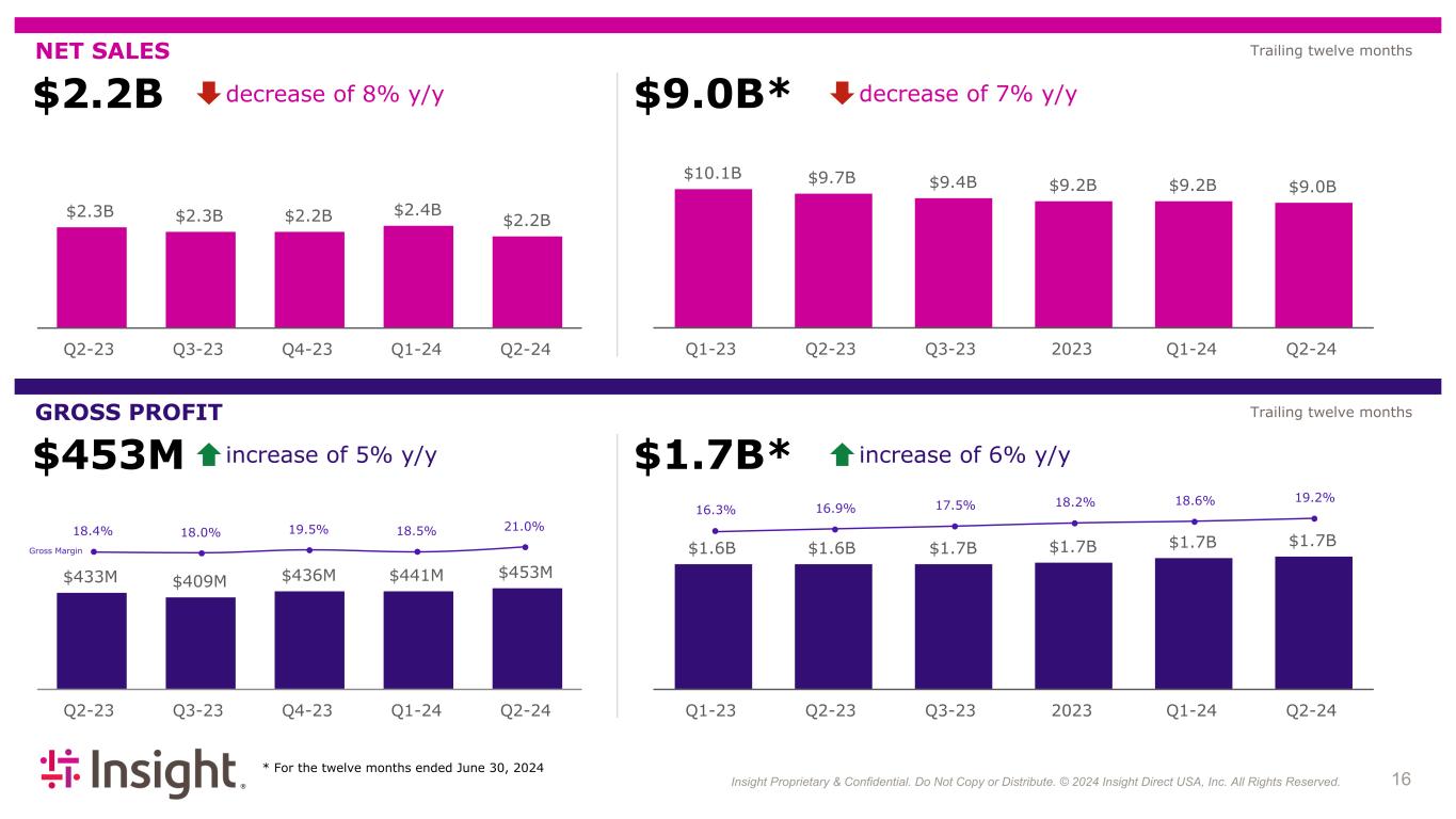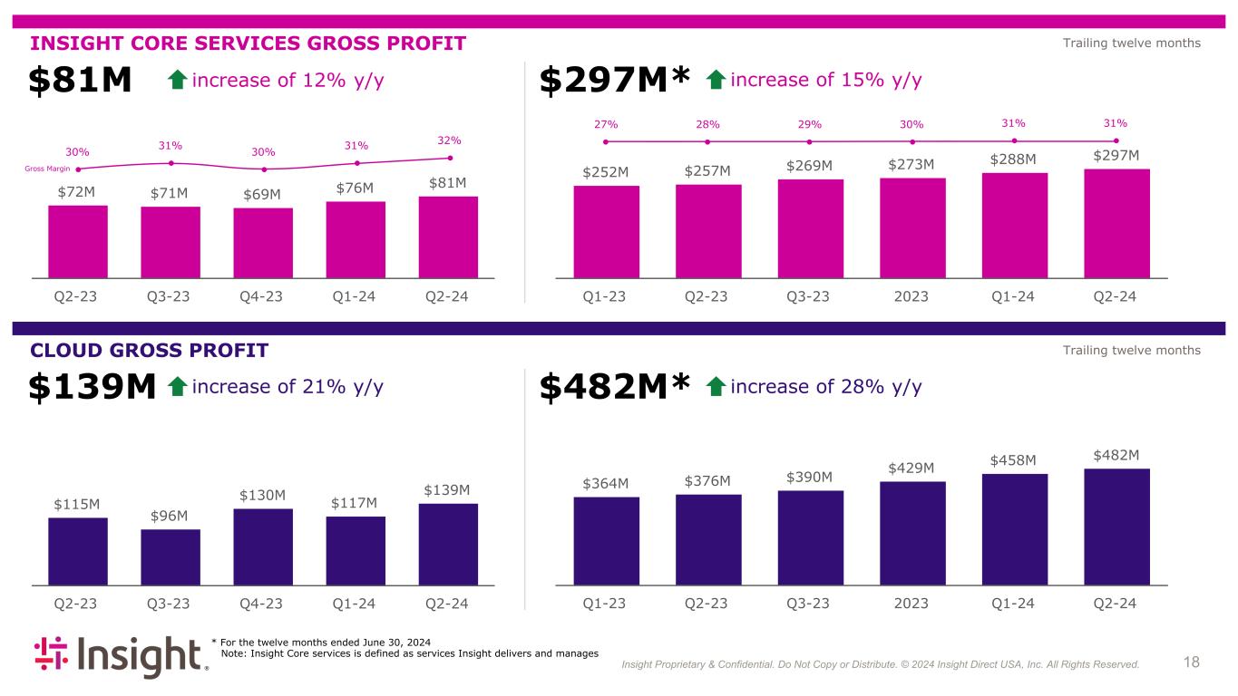 •Consolidated gross profit increased 5% compared to the second quarter of 2023 to $453.4 million, with consolidated gross margin expanding 260 basis points to 21.0% of net sales. Product gross profit decreased 3%, year to year, and services gross profit increased 11%, year over year. Cloud gross profit grew 21%, year over year, and Insight Core services gross profit increased 12%, year over year. By segment, gross profit: