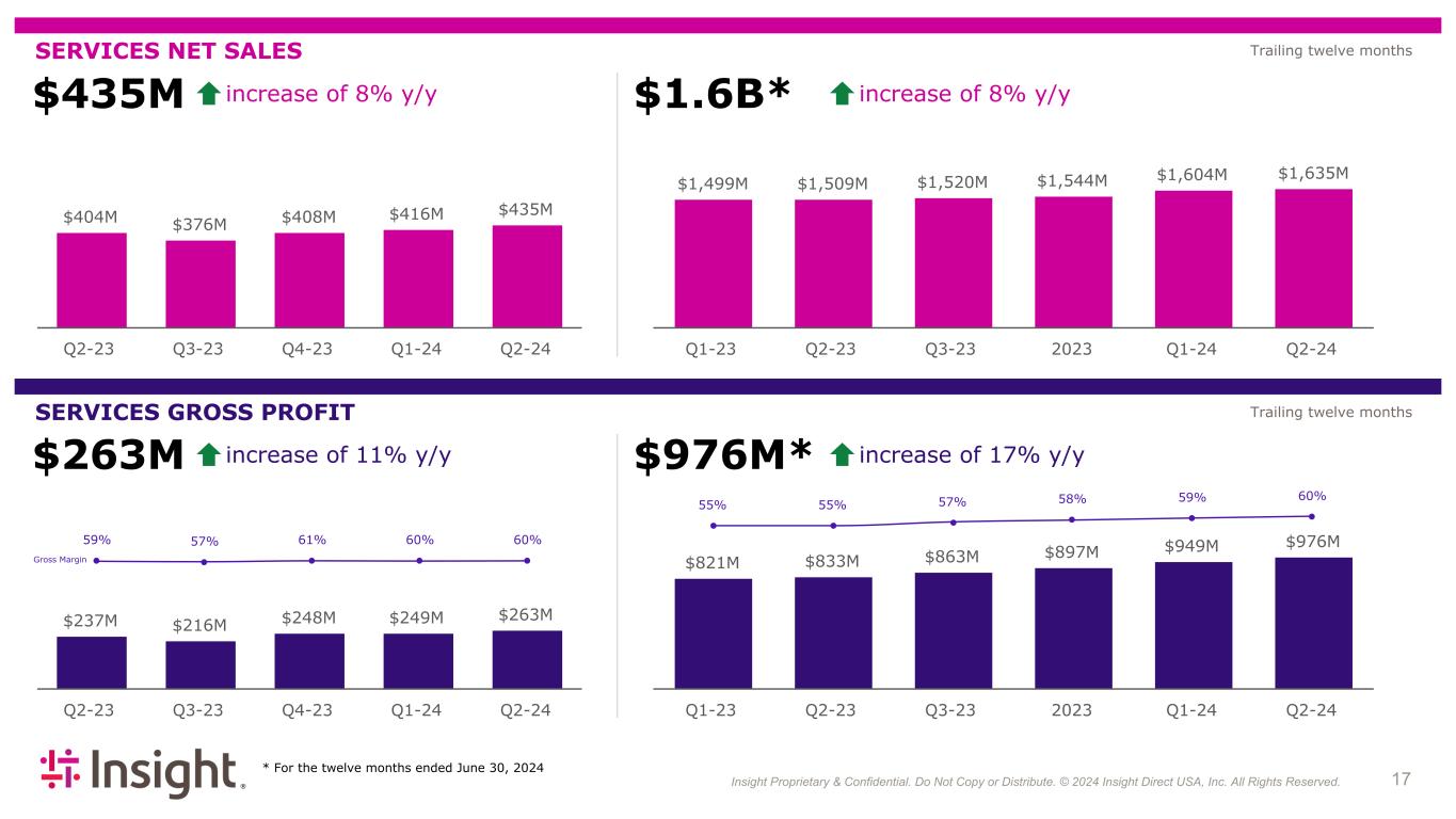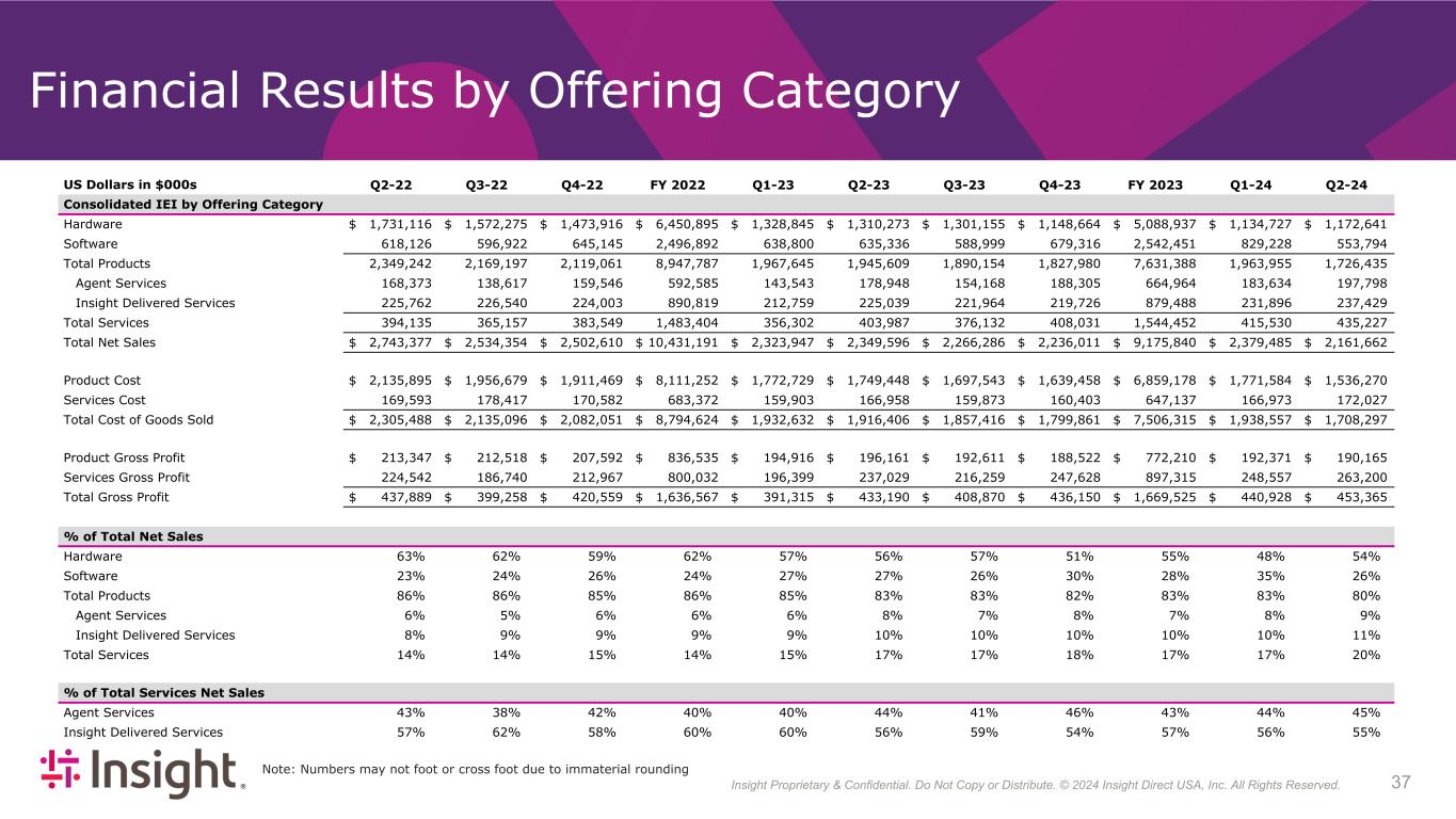Insight Proprietary & Confidential. Do Not Copy or Distribute. © 2022 Insight Direct USA, Inc. All Rights Reserved. 374 Financial Results by Offering Category US Dollars in $000s Q2-22 Q3-22 Q4-22 FY 2022 Q1-23 Q2-23 Q3-23 Q4-23 FY 2023 Q1-24 Q2-24 Consolidated IEI by Offering Category Hardware $ 1,731,116 $ 1,572,275 $ 1,473,916 $ 6,450,895 $ 1,328,845 $ 1,310,273 $ 1,301,155 $ 1,148,664 $ 5,088,937 $ 1,134,727 $ 1,172,641 Software 618,126 596,922 645,145 2,496,892 638,800 635,336 588,999 679,316 2,542,451 829,228 553,794 Total Products 2,349,242 2,169,197 2,119,061 8,947,787 1,967,645 1,945,609 1,890,154 1,827,980 7,631,388 1,963,955 1,726,435 Agent Services 168,373 138,617 159,546 592,585 143,543 178,948 154,168 188,305 664,964 183,634 197,798 Insight Delivered Services 225,762 226,540 224,003 890,819 212,759 225,039 221,964 219,726 879,488 231,896 237,429 Total Services 394,135 365,157 383,549 1,483,404 356,302 403,987 376,132 408,031 1,544,452 415,530 435,227 Total Net Sales $ 2,743,377 $ 2,534,354 $ 2,502,610 $ 10,431,191 $ 2,323,947 $ 2,349,596 $ 2,266,286 $ 2,236,011 $ 9,175,840 $ 2,379,485 $ 2,161,662 Product Cost $ 2,135,895 $ 1,956,679 $ 1,911,469 $ 8,111,252 $ 1,772,729 $ 1,749,448 $ 1,697,543 $ 1,639,458 $ 6,859,178 $ 1,771,584 $ 1,536,270 Services Cost 169,593 178,417 170,582 683,372 159,903 166,958 159,873 160,403 647,137 166,973 172,027 Total Cost of Goods Sold $ 2,305,488 $ 2,135,096 $ 2,082,051 $ 8,794,624 $ 1,932,632 $ 1,916,406 $ 1,857,416 $ 1,799,861 $ 7,506,315 $ 1,938,557 $ 1,708,297 Product Gross Profit $ 213,347 $ 212,518 $ 207,592 $ 836,535 $ 194,916 $ 196,161 $ 192,611 $ 188,522 $ 772,210 $ 192,371 $ 190,165 Services Gross Profit 224,542 186,740 212,967 800,032 196,399 237,029 216,259 247,628 897,315 248,557 263,200 Total Gross Profit $ 437,889 $ 399,258 $ 420,559 $ 1,636,567 $ 391,315 $ 433,190 $ 408,870 $ 436,150 $ 1,669,525 $ 440,928 $ 453,365 % of Total Net Sales Hardware 63 % 62 % 59 % 62 % 57 % 56 % 57 % 51 % 55 % 48 % 54 % Software 23 % 24 % 26 % 24 % 27 % 27 % 26 % 30 % 28 % 35 % 26 % Total Products 86 % 86 % 85 % 86 % 85 % 83 % 83 % 82 % 83 % 83 % 80 % Agent Services 6 % 5 % 6 % 6 % 6 % 8 % 7 % 8 % 7 % 8 % 9 % Insight Delivered Services 8 % 9 % 9 % 9 % 9 % 10 % 10 % 10 % 10 % 10 % 11 % Total Services 14 % 14 % 15 % 14 % 15 % 17 % 17 % 18 % 17 % 17 % 20 % % of Total Services Net Sales Agent Services 43 % 38 % 42 % 40 % 40 % 44 % 41 % 46 % 43 % 44 % 45 % Insight Delivered Services 57 % 62 % 58 % 60 % 60 % 56 % 59 % 54 % 57 % 56 % 55 % Note: Numbers may not foot or cross foot due to immaterial rounding