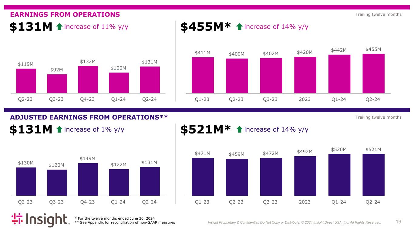 Insight Proprietary & Confidential. Do Not Copy or Distribute. © 2022 Insight Direct USA, Inc. All Rights Reserved. 194 EARNINGS FROM OPERATIONS ADJUSTED EARNINGS FROM OPERATIONS** * For the twelve months ended June 30, 2024 ** See Appendix for reconciliation of non-GAAP measures Trailing twelve months Trailing twelve months $119M $92M $132M $100M $131M Q2-23 Q3-23 Q4-23 Q1-24 Q2-24 $411M $400M $402M $420M $442M $455M Q1-23 Q2-23 Q3-23 2023 Q1-24 Q2-24 $131M increase of 11% y/y $455M* increase of 14% y/y $130M $120M $149M $122M $131M Q2-23 Q3-23 Q4-23 Q1-24 Q2-24 $131M increase of 1% y/y $471M $459M $472M $492M $520M $521M Q1-23 Q2-23 Q3-23 2023 Q1-24 Q2-24 $521M* increase of 14% y/y