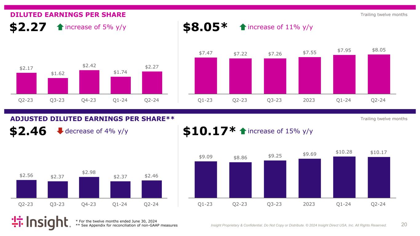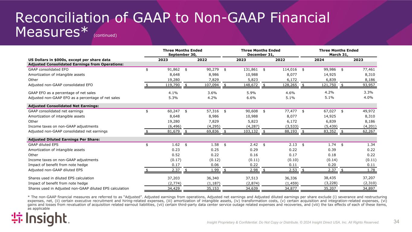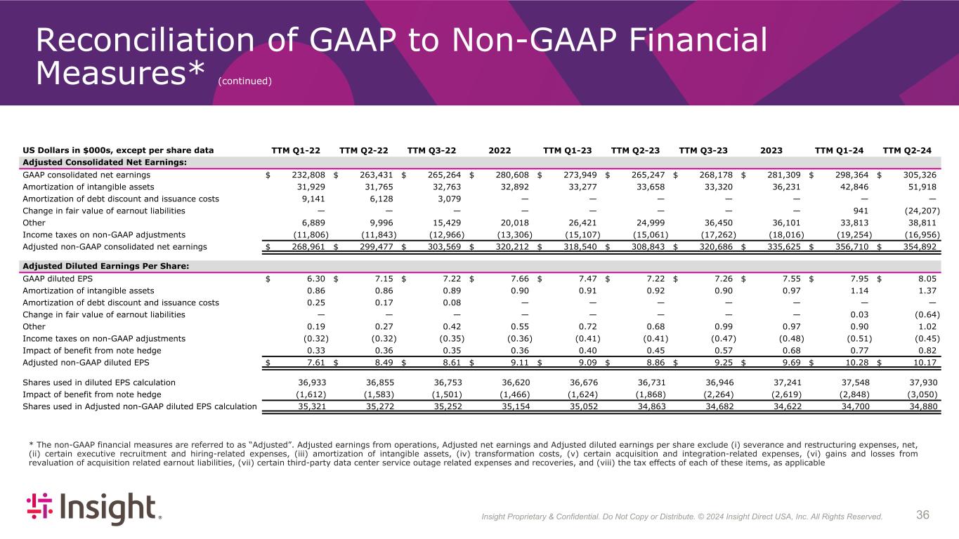 Insight Proprietary & Confidential. Do Not Copy or Distribute. © 2022 Insight Direct USA, Inc. All Rights Reserved. 284 Reconciliation of GAAP to Non-GAAP Financial Measures* (continued) Three Months Ended June 30, Six Months Ended June 30, US Dollars in $000s, except per share data 2024 2023 2022 2024 2023 Adjusted Consolidated Net Earnings: GAAP consolidated net earnings $ 87,444 $ 80,482 $ 89,184 $ 154,471 $ 130,454 Amortization of intangible assets 17,357 8,285 7,904 32,282 16,595 Gain on revaluation of earnout liabilities (25,148) — — (24,207) — Other** 7,810 2,812 4,234 13,708 10,998 Income taxes on non-GAAP adjustments (734) (3,032) (3,078) (6,173) (7,233) Adjusted non-GAAP consolidated net earnings $ 86,729 $ 88,547 $ 98,244 $ 170,081 $ 150,814 Adjusted Diluted Earnings Per Share: GAAP diluted EPS $ 2.27 $ 2.17 $ 2.42 $ 4.01 $ 3.51 Amortization of intangible assets 0.45 0.22 0.21 0.84 0.45 Gain on revaluation of earnout liabilities (0.65) — — (0.63) — Other 0.20 0.08 0.11 0.36 0.30 Income taxes on non-GAAP adjustments (0.02) (0.08) (0.08) (0.16) (0.19) Impact of benefit from note hedge 0.21 0.17 0.12 0.41 0.27 Adjusted non-GAAP diluted EPS $ 2.46 $ 2.56 $ 2.78 $ 4.83 $ 4.34 Shares used in diluted EPS calculation 38,567 37,039 36,821 38,501 37,123 Impact of benefit from note hedge (3,322) (2,516) (1,539) (3,275) (2,413) Shares used in Adjusted non-GAAP diluted EPS calculation 35,245 34,523 35,282 35,226 34,710 * The non-GAAP financial measures are referred to as “Adjusted”. Adjusted earnings from operations, Adjusted net earnings and Adjusted diluted earnings per share exclude (i) severance and restructuring expenses, net, (ii) certain executive recruitment and hiring-related expenses, (iii) amortization of intangible assets, (iv) transformation costs, (v) certain acquisition and integration-related expenses, (vi) gains and losses from revaluation of acquisition related earnout liabilities, (vii) certain third-party data center service outage related expenses and recoveries, and (viii) the tax effects of each of these items, as applicable ** Includes transformation costs of $5.6 million and $6.2 million for the three months ended June 30, 2024 and 2023, respectively, and $7.9 million and $10.3 million for the six months ended June 30, 2024 and 2023, respectively