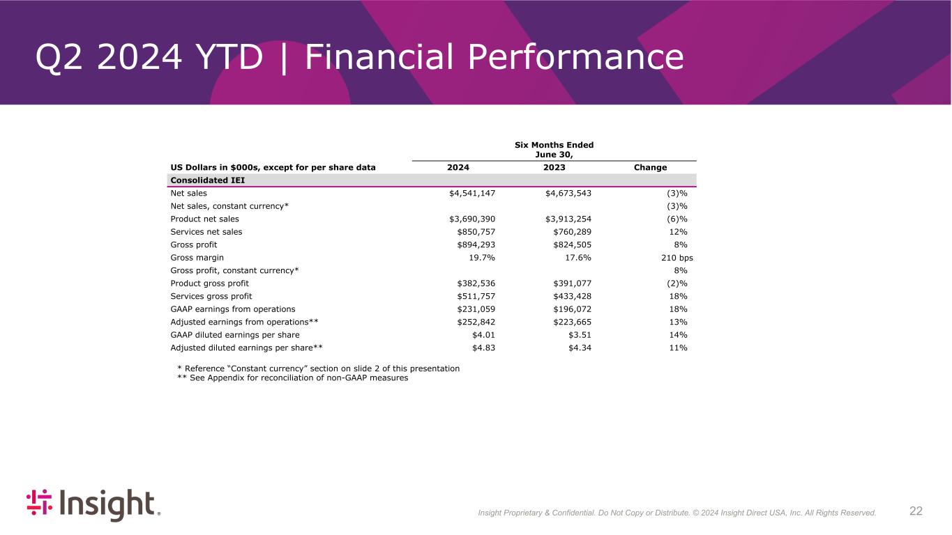 Insight Proprietary & Confidential. Do Not Copy or Distribute. © 2022 Insight Direct USA, Inc. All Rights Reserved. 224 Q2 2024 YTD | Financial Performance Six Months Ended June 30, US Dollars in $000s, except for per share data 2024 2023 Change Consolidated IEI Net sales $4,541,147 $4,673,543 (3) % Net sales, constant currency* (3) % Product net sales $3,690,390 $3,913,254 (6) % Services net sales $850,757 $760,289 12 % Gross profit $894,293 $824,505 8 % Gross margin 19.7 % 17.6 % 210 bps Gross profit, constant currency* 8 % Product gross profit $382,536 $391,077 (2) % Services gross profit $511,757 $433,428 18 % GAAP earnings from operations $231,059 $196,072 18 % Adjusted earnings from operations** $252,842 $223,665 13 % GAAP diluted earnings per share $4.01 $3.51 14 % Adjusted diluted earnings per share** $4.83 $4.34 11 % * Reference “Constant currency” section on slide 2 of this presentation ** See Appendix for reconciliation of non-GAAP measures