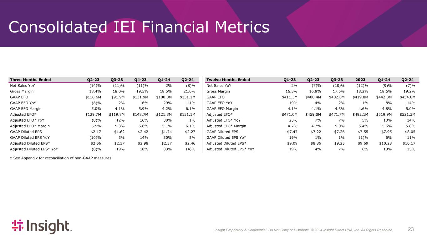 Insight Proprietary & Confidential. Do Not Copy or Distribute. © 2022 Insight Direct USA, Inc. All Rights Reserved. 234 * See Appendix for reconciliation of non-GAAP measures Consolidated IEI Financial Metrics Three Months Ended Q2-23 Q3-23 Q4-23 Q1-24 Q2-24 Net Sales YoY (14) % (11) % (11) % 2 % (8) % Gross Margin 18.4 % 18.0 % 19.5 % 18.5 % 21.0 % GAAP EFO $118.6M $91.9M $131.9M $100.0M $131.1M GAAP EFO YoY (8) % 2 % 16 % 29 % 11 % GAAP EFO Margin 5.0 % 4.1 % 5.9 % 4.2 % 6.1 % Adjusted EFO* $129.7M $119.8M $148.7M $121.8M $131.1M Adjusted EFO* YoY (8) % 12 % 16 % 30 % 1 % Adjusted EFO* Margin 5.5 % 5.3 % 6.6 % 5.1 % 6.1 % GAAP Diluted EPS $2.17 $1.62 $2.42 $1.74 $2.27 GAAP Diluted EPS YoY (10) % 3 % 14 % 30 % 5 % Adjusted Diluted EPS* $2.56 $2.37 $2.98 $2.37 $2.46 Adjusted Diluted EPS* YoY (8) % 19 % 18 % 33 % (4) % Twelve Months Ended Q1-23 Q2-23 Q3-23 2023 Q1-24 Q2-24 Net Sales YoY 2 % (7) % (10) % (12) % (9) % (7) % Gross Margin 16.3 % 16.9 % 17.5 % 18.2 % 18.6 % 19.2 % GAAP EFO $411.3M $400.4M $402.0M $419.8M $442.3M $454.8M GAAP EFO YoY 19 % 4 % 2 % 1 % 8 % 14 % GAAP EFO Margin 4.1 % 4.1 % 4.3 % 4.6 % 4.8 % 5.0 % Adjusted EFO* $471.0M $459.0M $471.7M $492.1M $519.9M $521.3M Adjusted EFO* YoY 23 % 7 % 7 % 5 % 10 % 14 % Adjusted EFO* Margin 4.7 % 4.7 % 5.0 % 5.4 % 5.6 % 5.8 % GAAP Diluted EPS $7.47 $7.22 $7.26 $7.55 $7.95 $8.05 GAAP Diluted EPS YoY 19 % 1 % 1 % (1) % 6 % 11 % Adjusted Diluted EPS* $9.09 $8.86 $9.25 $9.69 $10.28 $10.17 Adjusted Diluted EPS* YoY 19 % 4 % 7 % 6 % 13 % 15 %