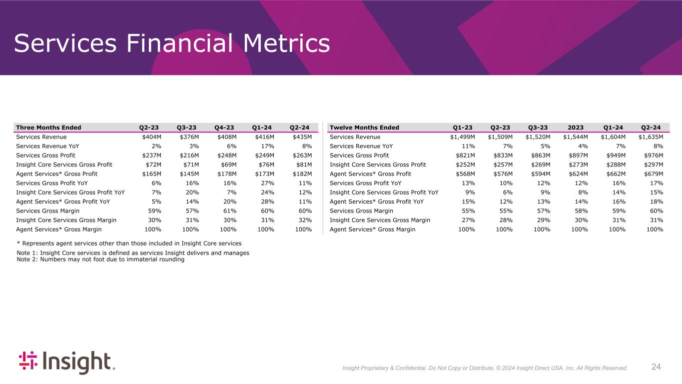 Insight Proprietary & Confidential. Do Not Copy or Distribute. © 2022 Insight Direct USA, Inc. All Rights Reserved. 244 Services Financial Metrics Three Months Ended Q2-23 Q3-23 Q4-23 Q1-24 Q2-24 Services Revenue $404M $376M $408M $416M $435M Services Revenue YoY 2% 3% 6% 17% 8% Services Gross Profit $237M $216M $248M $249M $263M Insight Core Services Gross Profit $72M $71M $69M $76M $81M Agent Services* Gross Profit $165M $145M $178M $173M $182M Services Gross Profit YoY 6% 16% 16% 27% 11% Insight Core Services Gross Profit YoY 7% 20% 7% 24% 12% Agent Services* Gross Profit YoY 5% 14% 20% 28% 11% Services Gross Margin 59% 57% 61% 60% 60% Insight Core Services Gross Margin 30% 31% 30% 31% 32% Agent Services* Gross Margin 100% 100% 100% 100% 100% Twelve Months Ended Q1-23 Q2-23 Q3-23 2023 Q1-24 Q2-24 Services Revenue $1,499M $1,509M $1,520M $1,544M $1,604M $1,635M Services Revenue YoY 11% 7% 5% 4% 7% 8% Services Gross Profit $821M $833M $863M $897M $949M $976M Insight Core Services Gross Profit $252M $257M $269M $273M $288M $297M Agent Services* Gross Profit $568M $576M $594M $624M $662M $679M Services Gross Profit YoY 13% 10% 12% 12% 16% 17% Insight Core Services Gross Profit YoY 9% 6% 9% 8% 14% 15% Agent Services* Gross Profit YoY 15% 12% 13% 14% 16% 18% Services Gross Margin 55% 55% 57% 58% 59% 60% Insight Core Services Gross Margin 27% 28% 29% 30% 31% 31% Agent Services* Gross Margin 100% 100% 100% 100% 100% 100% * Represents agent services other than those included in Insight Core services Note 1: Insight Core services is defined as services Insight delivers and manages Note 2: Numbers may not foot due to immaterial rounding