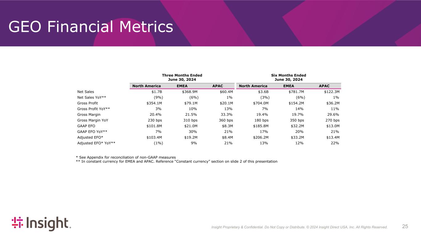 Insight Proprietary & Confidential. Do Not Copy or Distribute. © 2022 Insight Direct USA, Inc. All Rights Reserved. 254 * See Appendix for reconciliation of non-GAAP measures ** In constant currency for EMEA and APAC. Reference “Constant currency” section on slide 2 of this presentation GEO Financial Metrics Three Months Ended June 30, 2024 Six Months Ended June 30, 2024 North America EMEA APAC North America EMEA APAC Net Sales $1.7B $368.9M $60.4M $3.6B $781.7M $122.3M Net Sales YoY** (9%) (6%) 1% (3%) (6%) 1% Gross Profit $354.1M $79.1M $20.1M $704.0M $154.2M $36.2M Gross Profit YoY** 3% 10% 13% 7% 14% 11% Gross Margin 20.4% 21.5% 33.3% 19.4% 19.7% 29.6% Gross Margin YoY 230 bps 310 bps 360 bps 180 bps 350 bps 270 bps GAAP EFO $101.8M $21.0M $8.3M $185.8M $32.2M $13.0M GAAP EFO YoY** 7% 30% 21% 17% 20% 21% Adjusted EFO* $103.4M $19.2M $8.4M $206.2M $33.2M $13.4M Adjusted EFO* YoY** (1%) 9% 21% 13% 12% 22%