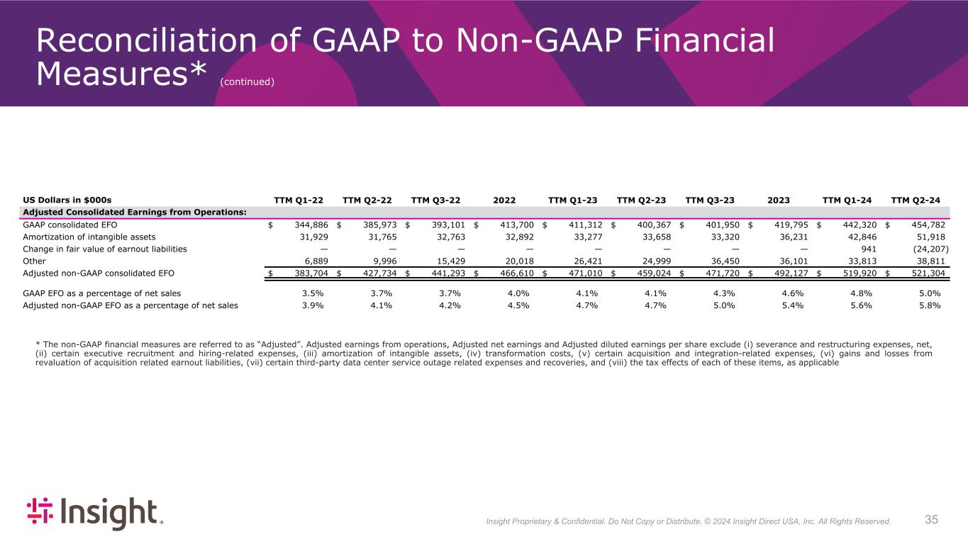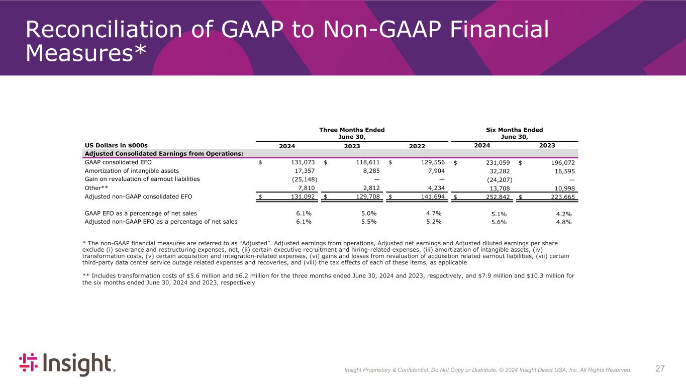 Insight Proprietary & Confidential. Do Not Copy or Distribute. © 2022 Insight Direct USA, Inc. All Rights Reserved. 274 Reconciliation of GAAP to Non-GAAP Financial Measures* Three Months Ended June 30, Six Months Ended June 30, US Dollars in $000s 2024 2023 2022 2024 2023 Adjusted Consolidated Earnings from Operations: GAAP consolidated EFO $ 131,073 $ 118,611 $ 129,556 $ 231,059 $ 196,072 Amortization of intangible assets 17,357 8,285 7,904 32,282 16,595 Gain on revaluation of earnout liabilities (25,148) — — (24,207) — Other** 7,810 2,812 4,234 13,708 10,998 Adjusted non-GAAP consolidated EFO $ 131,092 $ 129,708 $ 141,694 $ 252,842 $ 223,665 GAAP EFO as a percentage of net sales 6.1 % 5.0 % 4.7 % 5.1 % 4.2 % Adjusted non-GAAP EFO as a percentage of net sales 6.1 % 5.5 % 5.2 % 5.6 % 4.8 % * The non-GAAP financial measures are referred to as “Adjusted”. Adjusted earnings from operations, Adjusted net earnings and Adjusted diluted earnings per share exclude (i) severance and restructuring expenses, net, (ii) certain executive recruitment and hiring-related expenses, (iii) amortization of intangible assets, (iv) transformation costs, (v) certain acquisition and integration-related expenses, (vi) gains and losses from revaluation of acquisition related earnout liabilities, (vii) certain third-party data center service outage related expenses and recoveries, and (viii) the tax effects of each of these items, as applicable ** Includes transformation costs of $5.6 million and $6.2 million for the three months ended June 30, 2024 and 2023, respectively, and $7.9 million and $10.3 million for the six months ended June 30, 2024 and 2023, respectively