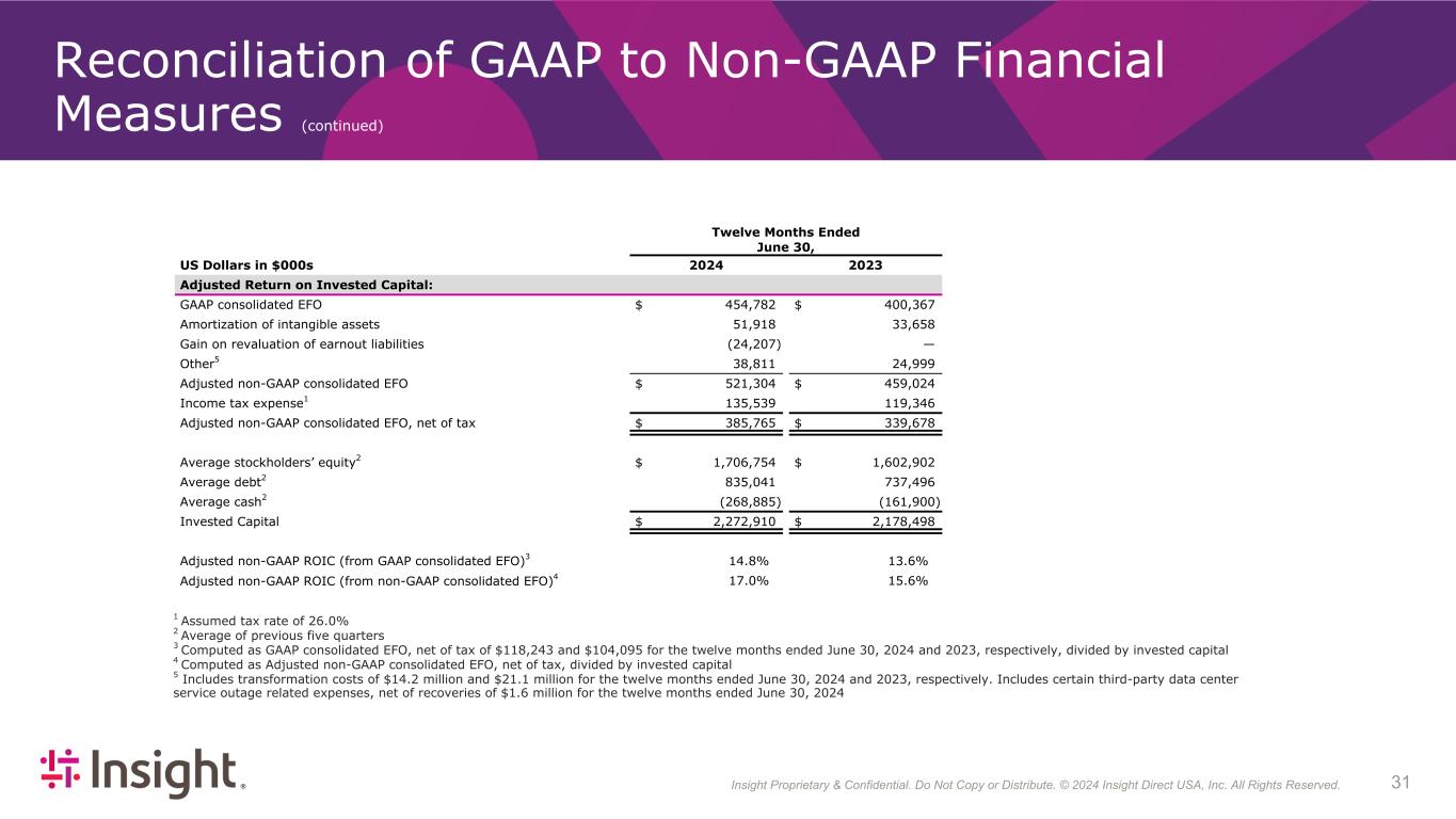 Insight Proprietary & Confidential. Do Not Copy or Distribute. © 2022 Insight Direct USA, Inc. All Rights Reserved. 314 Reconciliation of GAAP to Non-GAAP Financial Measures (continued) 1 Assumed tax rate of 26.0% 2 Average of previous five quarters 3 Computed as GAAP consolidated EFO, net of tax of $118,243 and $104,095 for the twelve months ended June 30, 2024 and 2023, respectively, divided by invested capital 4 Computed as Adjusted non-GAAP consolidated EFO, net of tax, divided by invested capital 5 Includes transformation costs of $14.2 million and $21.1 million for the twelve months ended June 30, 2024 and 2023, respectively. Includes certain third-party data center service outage related expenses, net of recoveries of $1.6 million for the twelve months ended June 30, 2024 Twelve Months Ended June 30, US Dollars in $000s 2024 2023 Adjusted Return on Invested Capital: GAAP consolidated EFO $ 454,782 $ 400,367 Amortization of intangible assets 51,918 33,658 Gain on revaluation of earnout liabilities (24,207) — Other5 38,811 24,999 Adjusted non-GAAP consolidated EFO $ 521,304 $ 459,024 Income tax expense1 135,539 119,346 Adjusted non-GAAP consolidated EFO, net of tax $ 385,765 $ 339,678 Average stockholders’ equity2 $ 1,706,754 $ 1,602,902 Average debt2 835,041 737,496 Average cash2 (268,885) (161,900) Invested Capital $ 2,272,910 $ 2,178,498 Adjusted non-GAAP ROIC (from GAAP consolidated EFO)3 14.8 % 13.6 % Adjusted non-GAAP ROIC (from non-GAAP consolidated EFO)4 17.0 % 15.6 %