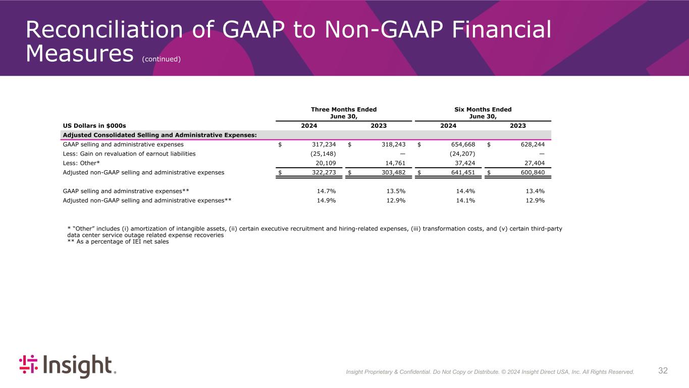 Insight Proprietary & Confidential. Do Not Copy or Distribute. © 2022 Insight Direct USA, Inc. All Rights Reserved. 324 Reconciliation of GAAP to Non-GAAP Financial Measures (continued) Three Months Ended June 30, Six Months Ended June 30, US Dollars in $000s 2024 2023 2024 2023 Adjusted Consolidated Selling and Administrative Expenses: GAAP selling and administrative expenses $ 317,234 $ 318,243 $ 654,668 $ 628,244 Less: Gain on revaluation of earnout liabilities (25,148) — (24,207) — Less: Other* 20,109 14,761 37,424 27,404 Adjusted non-GAAP selling and administrative expenses $ 322,273 $ 303,482 $ 641,451 $ 600,840 GAAP selling and adminstrative expenses** 14.7 % 13.5 % 14.4 % 13.4 % Adjusted non-GAAP selling and administrative expenses** 14.9 % 12.9 % 14.1 % 12.9 % * “Other” includes (i) amortization of intangible assets, (ii) certain executive recruitment and hiring-related expenses, (iii) transformation costs, and (v) certain third-party data center service outage related expense recoveries ** As a percentage of IEI net sales