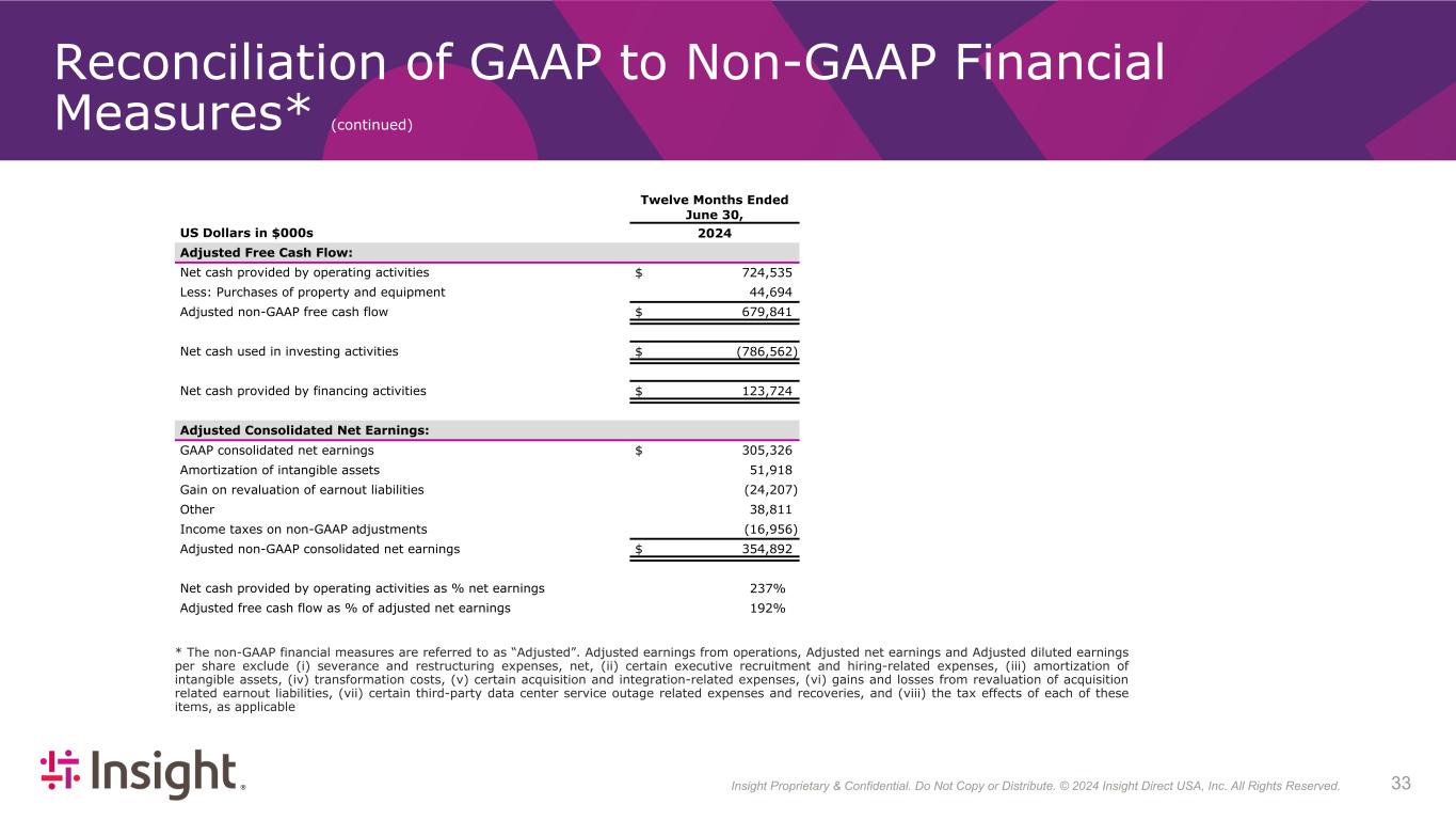 Insight Proprietary & Confidential. Do Not Copy or Distribute. © 2022 Insight Direct USA, Inc. All Rights Reserved. 334 Reconciliation of GAAP to Non-GAAP Financial Measures* (continued) Twelve Months Ended June 30, US Dollars in $000s 2024 Adjusted Free Cash Flow: Net cash provided by operating activities $ 724,535 Less: Purchases of property and equipment 44,694 Adjusted non-GAAP free cash flow $ 679,841 Net cash used in investing activities $ (786,562) Net cash provided by financing activities $ 123,724 Adjusted Consolidated Net Earnings: GAAP consolidated net earnings $ 305,326 Amortization of intangible assets 51,918 Gain on revaluation of earnout liabilities (24,207) Other 38,811 Income taxes on non-GAAP adjustments (16,956) Adjusted non-GAAP consolidated net earnings $ 354,892 Net cash provided by operating activities as % net earnings 237 % Adjusted free cash flow as % of adjusted net earnings 192 % * The non-GAAP financial measures are referred to as “Adjusted”. Adjusted earnings from operations, Adjusted net earnings and Adjusted diluted earnings per share exclude (i) severance and restructuring expenses, net, (ii) certain executive recruitment and hiring-related expenses, (iii) amortization of intangible assets, (iv) transformation costs, (v) certain acquisition and integration-related expenses, (vi) gains and losses from revaluation of acquisition related earnout liabilities, (vii) certain third-party data center service outage related expenses and recoveries, and (viii) the tax effects of each of these items, as applicable