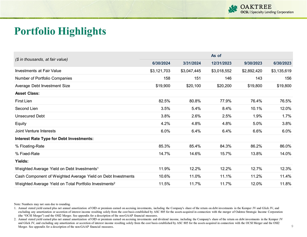 Financial Highlights As of ($ and number of shares in thousands, except per share amounts) 6/30/2024 3/31/2024 12/31/2023 9/30/2023 6/30/2023 GAAP Net Investment Income per Share $0.54 $0.52 $0.57 $0.62 $0.63 1 Adjusted Net Investment Income per Share $0.55 $0.56 $0.57 $0.62 $0.62 Net Realized and Unrealized Gains (Losses), Net of Taxes per Share -$0.53 -$0.40 -$0.43 -$0.02 -$0.15 1 Adjusted Net Realized and Unrealized Gains (Losses), Net of Taxes per Share -$0.54 -$0.44 -$0.42 -$0.02 -$0.14 Earnings (Loss) per Share $0.01 $0.12 $0.14 $0.60 $0.48 1 Adjusted Earnings (Loss) per Share $0.01 $0.12 $0.15 $0.60 $0.47 Quarterly Distributions per Share $0.55 $0.55 $0.55 $0.55 $0.55 Special Distributions per Share -- -- $0.07 -- -- NAV per Share $18.19 $18.72 $19.14 $19.63 $19.58 Weighted Average Shares Outstanding 81,830 79,763 77,840 77,130 77,080 Shares Outstanding, End of Period 82,245 81,396 78,965 77,225 77,080 Investment Portfolio (at Fair Value) $3,121,703 $3,047,445 $3,018,552 $2,892,420 $3,135,619 Cash and Cash Equivalents $96,321 $125,031 $112,369 $136,450 $59,704 Total Assets $3,322,181 $3,297,939 $3,266,195 $3,217,839 $3,335,974 2 Total Debt Outstanding $1,679,164 $1,635,642 $1,622,717 $1,600,731 $1,740,066 Net Assets $1,496,133 $1,524,099 $1,511,651 $1,515,764 $1,509,441 Total Debt to Equity Ratio 1.16x 1.10x 1.10x 1.10x 1.18x Net Debt to Equity Ratio 1.10x 1.02x 1.02x 1.01x 1.14x 3 Weighted Average Interest Rate on Debt Outstanding 7.0% 7.0% 7.0% 7.0% 6.6% 1. See appendix for a description of the non-GAAP measures as necessary. 2. Net of unamortized financing costs. 8 I 3. Includes effect of the interest rate swap agreements the Company entered into in connection with the issuance of the 2027 Notes and the 2029 Notes. n v e s t o r P r e s e n a t