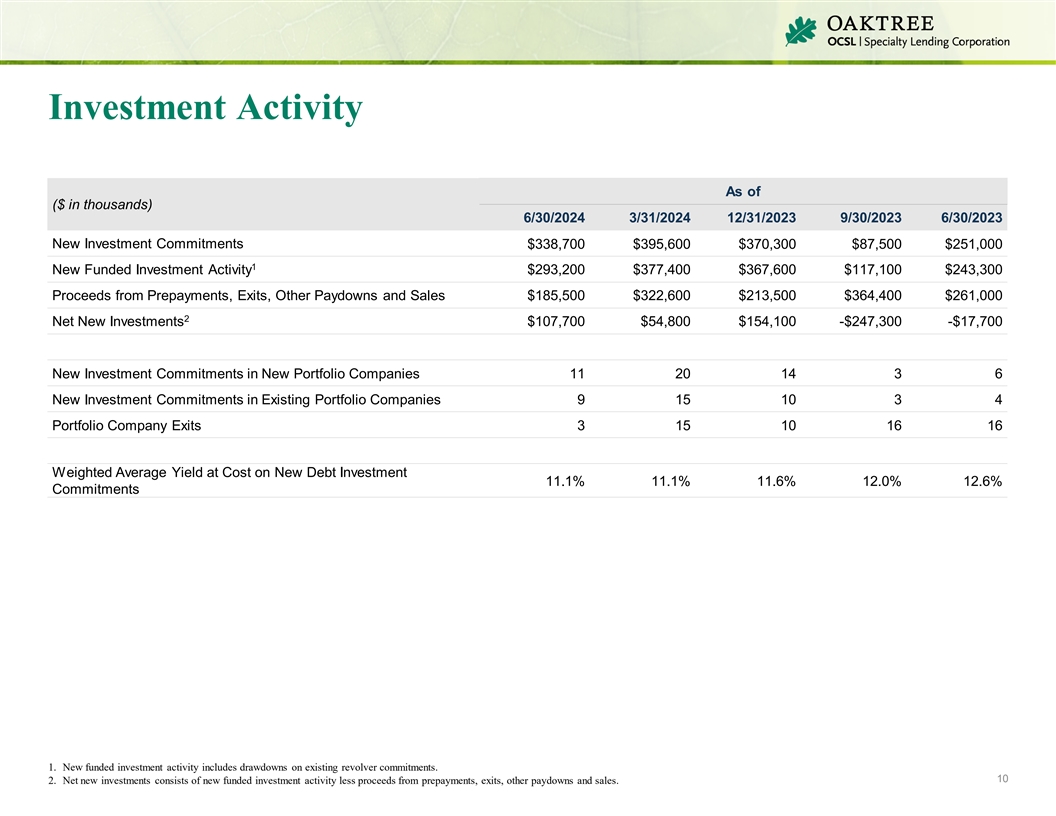 Portfolio Highlights As of ($ in thousands, at fair value) 6/30/2024 3/31/2024 12/31/2023 9/30/2023 6/30/2023 Investments at Fair Value $3,121,703 $3,047,445 $3,018,552 $2,892,420 $3,135,619 Number of Portfolio Companies 158 151 146 143 156 Average Debt Investment Size $19,900 $20,100 $20,200 $19,800 $19,800 Asset Class: First Lien 82.5% 80.8% 77.9% 76.4% 76.5% Second Lien 3.5% 5.4% 8.4% 10.1% 12.0% Unsecured Debt 3.8% 2.6% 2.5% 1.9% 1.7% Equity 4.2% 4.8% 4.8% 5.0% 3.8% Joint Venture Interests 6.0% 6.4% 6.4% 6.6% 6.0% Interest Rate Type for Debt Investments: % Floating-Rate 85.3% 85.4% 84.3% 86.2% 86.0% % Fixed-Rate 14.7% 14.6% 15.7% 13.8% 14.0% Yields: 1 Weighted Average Yield on Debt Investments 11.9% 12.2% 12.2% 12.7% 12.3% Cash Component of Weighted Average Yield on Debt Investments 10.6% 11.0% 11.1% 11.2% 11.4% 2 Weighted Average Yield on Total Portfolio Investments 11.5% 11.7% 11.7% 12.0% 11.8% Note: Numbers may not sum due to rounding. 1. Annual stated yield earned plus net annual amortization of OID or premium earned on accruing investments, including the Company's share of the return on debt investments in the Kemper JV and Glick JV, and excluding any amortization or accretion of interest income resulting solely from the cost basis established by ASC 805 for the assets acquired in connection with the merger of Oaktree Strategic Income Corporation (the “OCSI Merger”) and the OSI2 Merger. See appendix for a description of the non-GAAP financial measures. 2. Annual stated yield earned plus net annual amortization of OID or premium earned on accruing investments and dividend income, including the Company's share of the return on debt investments in the Kemper JV and Glick JV, and excluding any amortization or accretion of interest income resulting solely from the cost basis established by ASC 805 for the assets acquired in connection with the OCSI Merger and the OSI2 9 Merger. See appendix for a description of the non-GAAP financial measures.