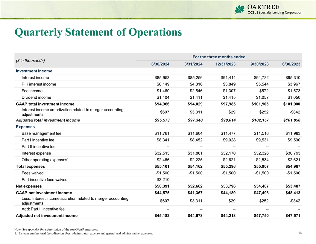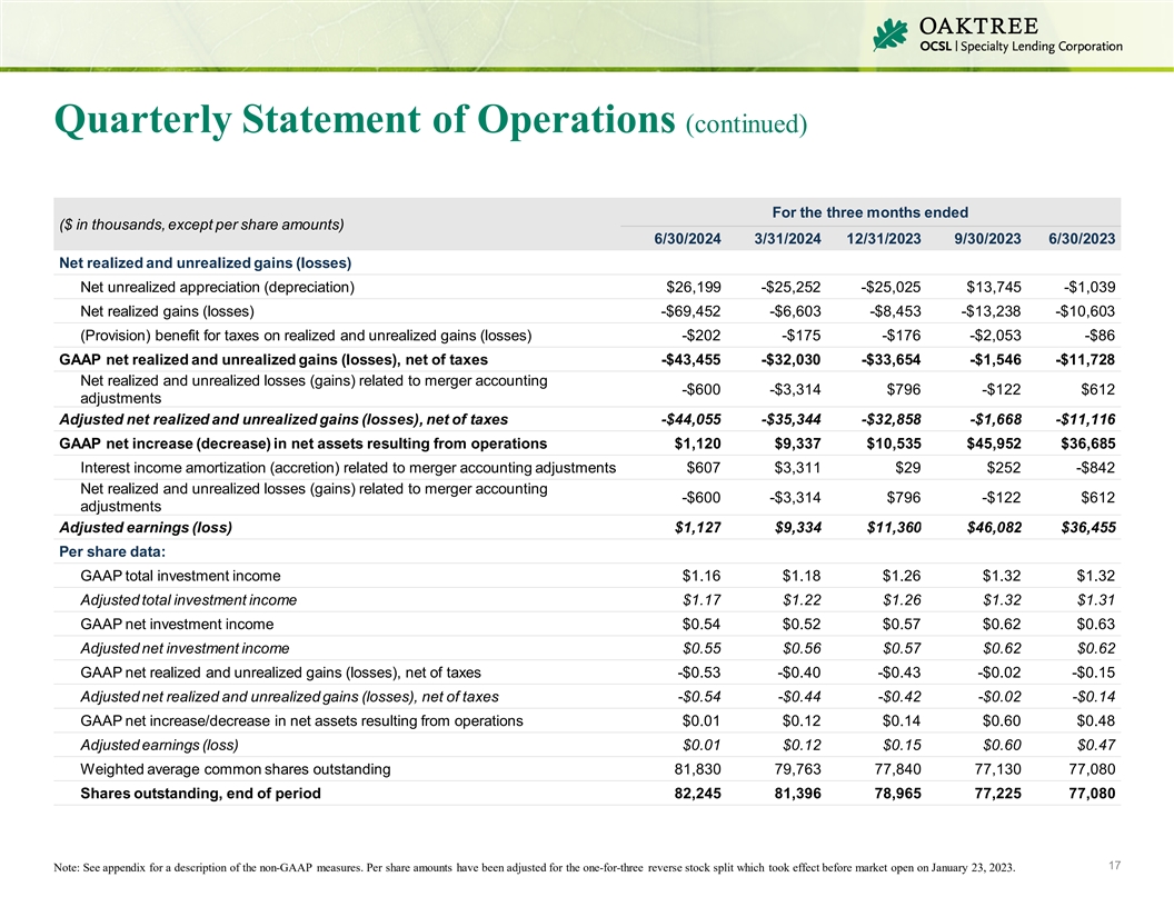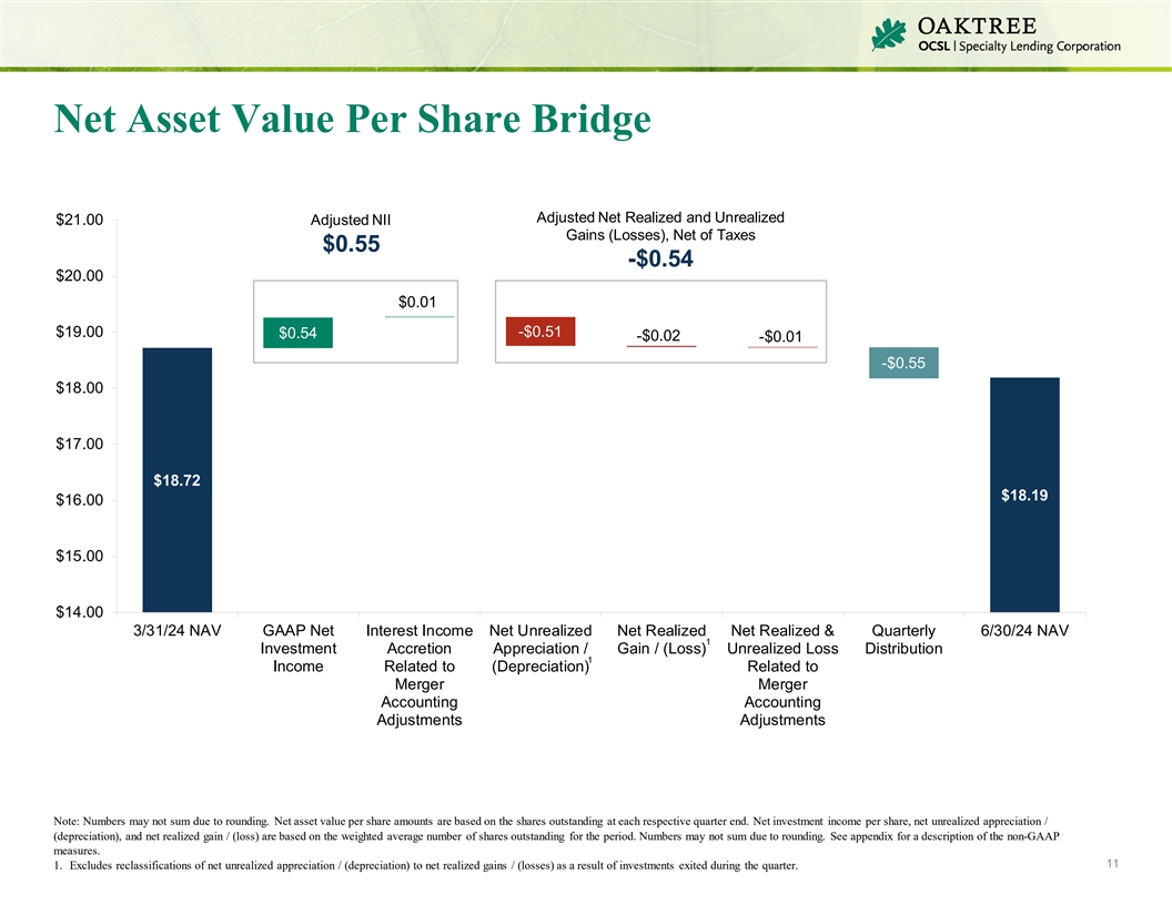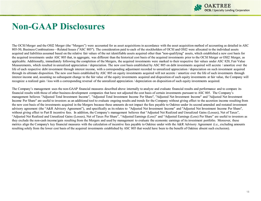 Non-GAAP Disclosures The OCSI Merger and the OSI2 Merger (the “Mergers”) were accounted for as asset acquisitions in accordance with the asset acquisition method of accounting as detailed in ASC 805-50, Business Combinations—Related Issues ( ASC 805 ). The consideration paid to each of the stockholders of OCSI and OSI2 were allocated to the individual assets acquired and liabilities assumed based on the relative fair values of the net identifiable assets acquired other than non-qualifying assets, which established a new cost basis for the acquired investments under ASC 805 that, in aggregate, was different than the historical cost basis of the acquired investments prior to the OCSI Merger or OSI2 Merger, as applicable. Additionally, immediately following the completion of the Mergers, the acquired investments were marked to their respective fair values under ASC 820, Fair Value Measurements, which resulted in unrealized appreciation / depreciation. The new cost basis established by ASC 805 on debt investments acquired will accrete / amortize over the life of each respective debt investment through interest income, with a corresponding adjustment recorded to unrealized appreciation / depreciation on such investment acquired through its ultimate disposition. The new cost basis established by ASC 805 on equity investments acquired will not accrete / amortize over the life of such investments through interest income and, assuming no subsequent change to the fair value of the equity investments acquired and disposition of such equity investments at fair value, the Company will recognize a realized gain / loss with a corresponding reversal of the unrealized appreciation / depreciation on disposition of such equity investments acquired. The Company’s management uses the non-GAAP financial measures described above internally to analyze and evaluate financial results and performance and to compare its financial results with those of other business development companies that have not adjusted the cost basis of certain investments pursuant to ASC 805. The Company’s management believes Adjusted Total Investment Income , Adjusted Total Investment Income Per Share , Adjusted Net Investment Income and Adjusted Net Investment Income Per Share are useful to investors as an additional tool to evaluate ongoing results and trends for the Company without giving effect to the accretion income resulting from the new cost basis of the investments acquired in the Mergers because these amounts do not impact the fees payable to Oaktree under its second amended and restated investment advisory agreement (the “A&R Advisory Agreement”), and specifically as its relates to Adjusted Net Investment Income and Adjusted Net Investment Income Per Share , without giving effect to Part II incentive fees. In addition, the Company’s management believes that “Adjusted Net Realized and Unrealized Gains (Losses), Net of Taxes”, “Adjusted Net Realized and Unrealized Gains (Losses), Net of Taxes Per Share”, “Adjusted Earnings (Loss)” and “Adjusted Earnings (Loss) Per Share” are useful to investors as they exclude the non-cash income/gain resulting from the Mergers and used by management to evaluate the economic earnings of its investment portfolio. Moreover, these metrics align the Company's key financial measures with the calculation of incentive fees payable to Oaktree under with the A&R Advisory Agreement (i.e., excluding amounts resulting solely from the lower cost basis of the acquired investments established by ASC 805 that would have been to the benefit of Oaktree absent such exclusion). 18 I n v e s t o r P r e s e n a t