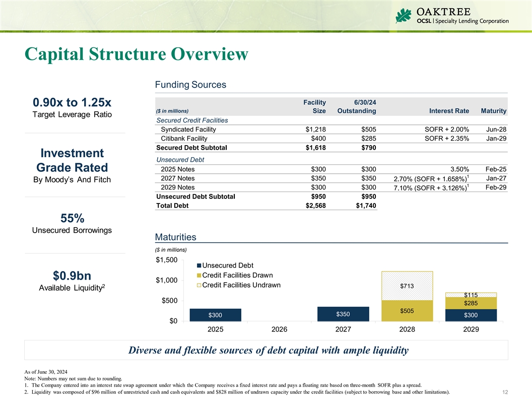 Investment Activity New Investment Highlights Historical Funded Originations and Exits ($ in millions) ($ in millions) $377 $368 $364 $400 Total New $323 $293 Commitments 11 $300 $339 $214 new borrowers $186 $200 $117 Existing Borrowers $100 $75 $0 9/30/23 12/31/23 3/31/24 6/30/24 9 1 2 New Funded Investments Investment Exits existing borrowers Seniority Breakdown (As % of new investment commitments; $ in millions) 11.1% New Borrowers $264 weighted average yield on new 0% 1% debt commitments First Lien - $270mm Subordinated Debt - $65mm 19% 100% Second Lien - $3mm 80% Equity - $1mm also held by other Oaktree funds As of June 30, 2024 Note: Numbers rounded to the nearest million or percentage point and may not sum as a result. 1. New funded investments includes drawdowns on existing delayed draw and revolver commitments. 6 2. Investment exits includes proceeds from prepayments, exits, other paydowns and sales.
