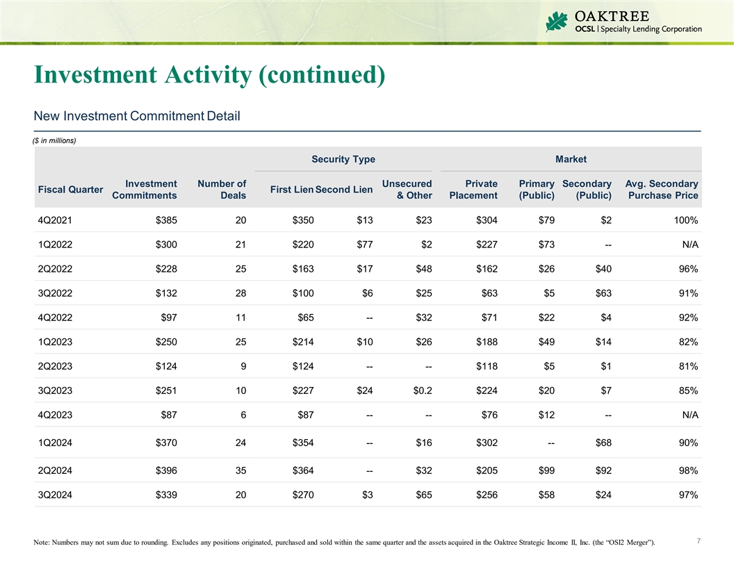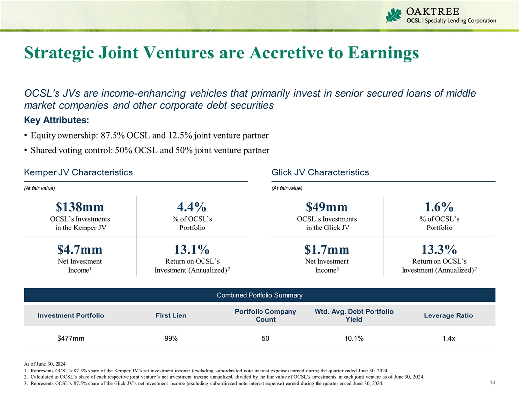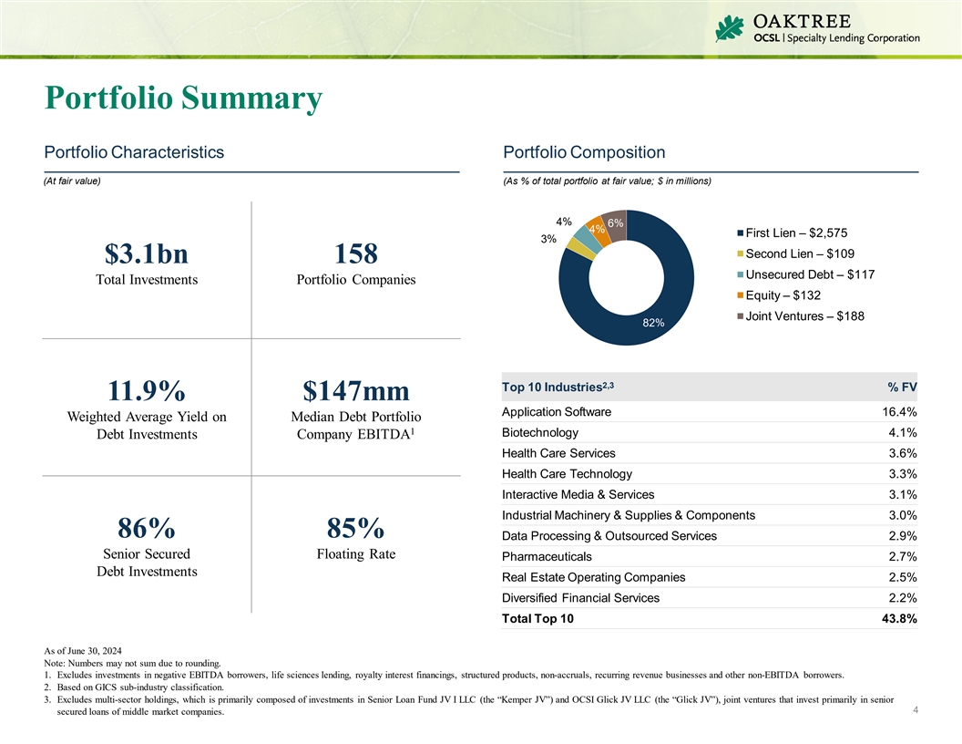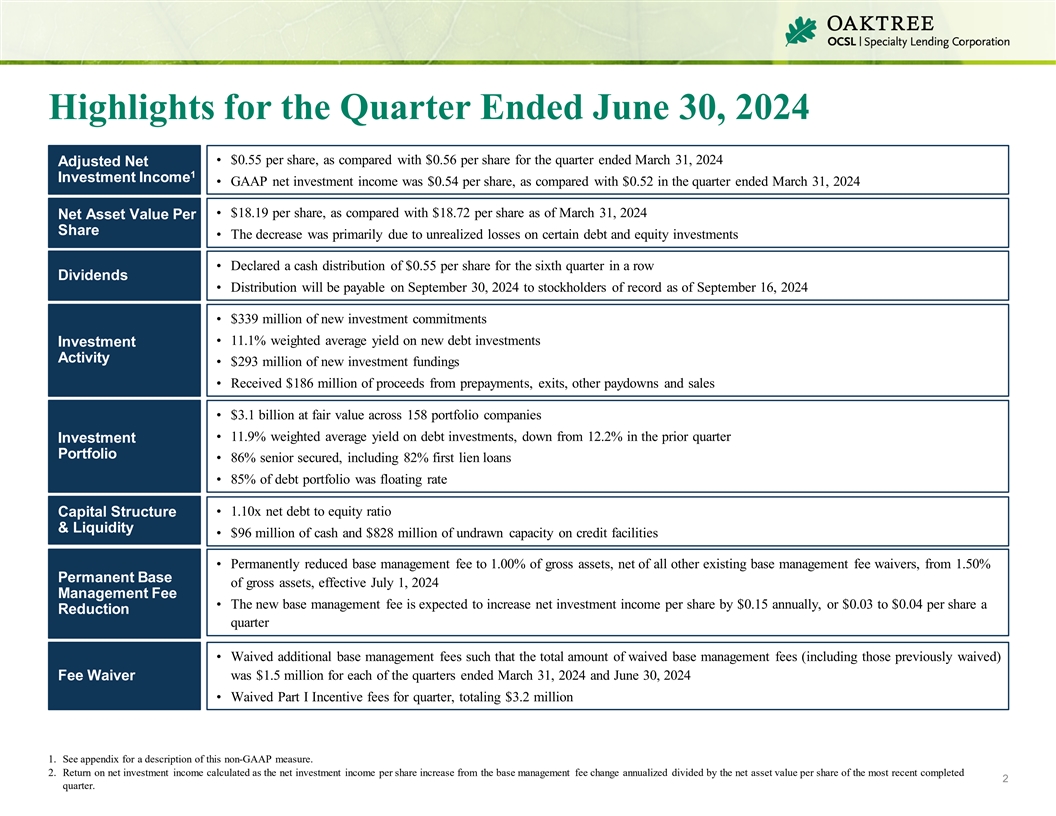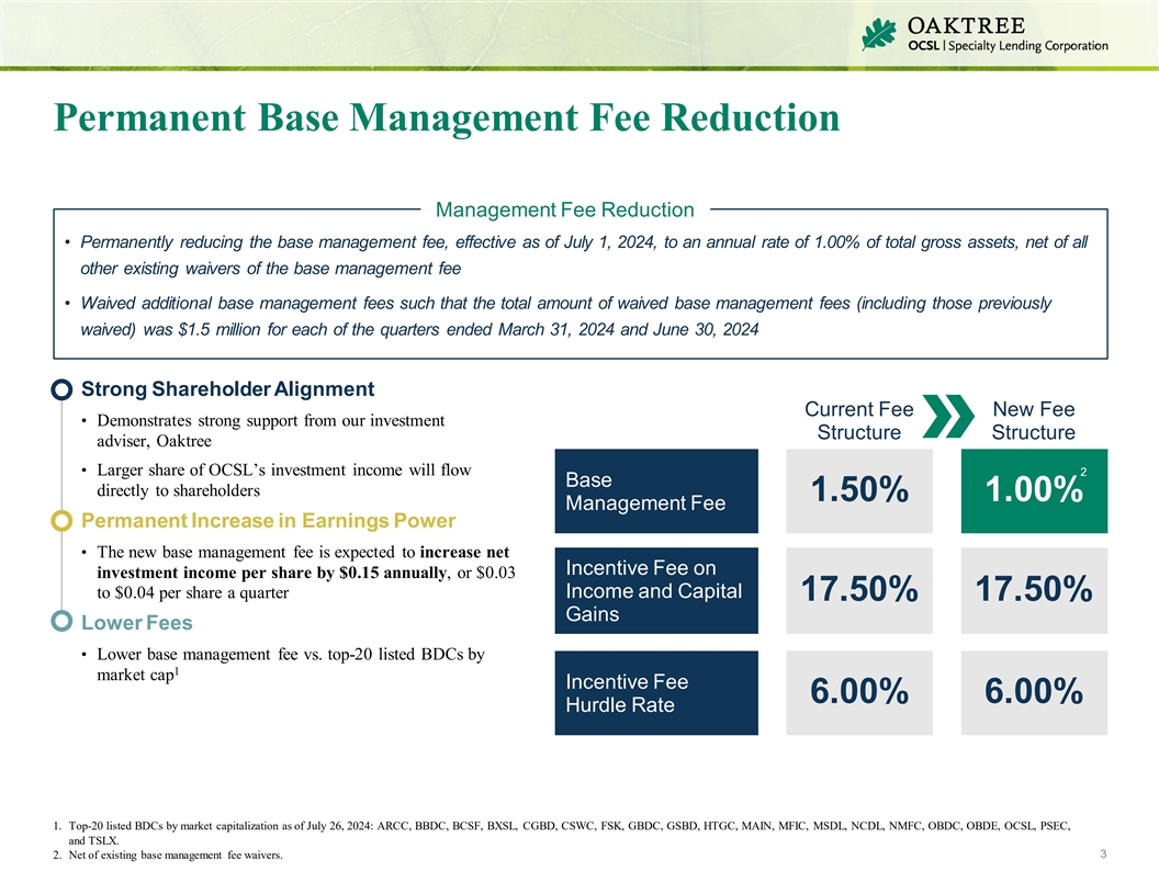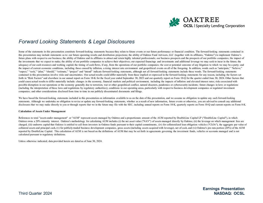 Forward Looking Statements & Legal Disclosures Some of the statements in this presentation constitute forward-looking statements because they relate to future events or our future performance or financial condition. The forward-looking statements contained in this presentation may include statements as to: our future operating results and distribution projections; the ability of Oaktree Fund Advisors, LLC (together with its affiliates, “Oaktree”) to implement Oaktree’s future plans with respect to our business; the ability of Oaktree and its affiliates to attract and retain highly talented professionals; our business prospects and the prospects of our portfolio companies; the impact of the investments that we expect to make; the ability of our portfolio companies to achieve their objectives; our expected financings and investments and additional leverage we may seek to incur in the future; the adequacy of our cash resources and working capital; the timing of cash flows, if any, from the operations of our portfolio companies; the cost or potential outcome of any litigation to which we may be a party; and the impact of current economic conditions, including those caused by inflation, a rising interest rate environment and geopolitical events on all of the foregoing. In addition, words such as “anticipate,” “believe,” “expect,” “seek,” “plan,” “should,” “estimate,” “project” and “intend” indicate forward-looking statements, although not all forward-looking statements include these words. The forward-looking statements contained in this presentation involve risks and uncertainties. Our actual results could differ materially from those implied or expressed in the forward-looking statements for any reason, including the factors set forth in “Risk Factors” and elsewhere in our annual report on Form 10-K for the fiscal year ended September 30, 2023 and our quarterly report on Form 10-Q for the quarter ended June 30, 2024. Other factors that could cause actual results to differ materially include: changes in the economy, financial markets and political environment, including the impacts of inflation and elevated interest rates; risks associated with possible disruption in our operations or the economy generally due to terrorism, war or other geopolitical conflict, natural disasters, pandemics or cybersecurity incidents; future changes in laws or regulations (including the interpretation of these laws and regulations by regulatory authorities); conditions in our operating areas, particularly with respect to business development companies or regulated investment companies; and other considerations disclosed from time to time in our publicly disseminated documents and filings. We have based the forward-looking statements included in this presentation on information available to us on the date of this presentation, and we assume no obligation to update any such forward-looking statements. Although we undertake no obligation to revise or update any forward-looking statements, whether as a result of new information, future events or otherwise, you are advised to consult any additional disclosures that we may make directly to you or through reports that we in the future may file with the SEC, including annual reports on Form 10-K, quarterly reports on Form 10-Q and current reports on Form 8-K. Calculation of Assets Under Management References to total assets under management or AUM represent assets managed by Oaktree and a proportionate amount of the AUM reported by DoubleLine Capital LP ( DoubleLine Capital ), in which Oaktree owns a 20% minority interest. Oaktree's methodology for calculating AUM includes (i) the net asset value (“NAV”) of assets managed directly by Oaktree, (ii) the leverage on which management fees are charged, (iii) undrawn capital that Oaktree is entitled to call from investors in Oaktree funds pursuant to their capital commitments, (iv) for collateralized loan obligation vehicles ( CLOs ), the aggregate par value of collateral assets and principal cash, (v) for publicly-traded business development companies, gross assets (including assets acquired with leverage), net of cash, and (vi) Oaktree's pro rata portion (20%) of the AUM reported by DoubleLine Capital. This calculation of AUM is not based on the definitions of AUM that may be set forth in agreements governing the investment funds, vehicles or accounts managed and is not calculated pursuant to regulatory definitions. Unless otherwise indicated, data provided herein are dated as of June 30, 2024. Earnings Presentation Third Quarter 2024 NASDAQ: OCSL