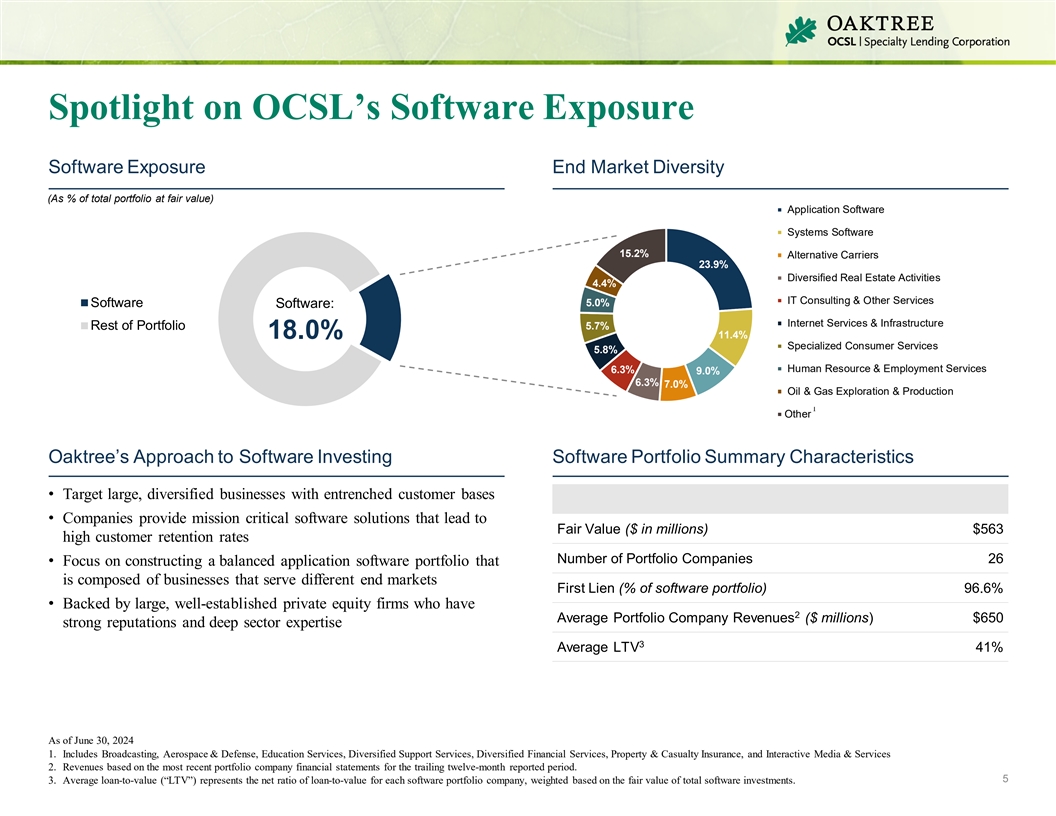 Portfolio Summary Portfolio Characteristics Portfolio Composition (At fair value) (As % of total portfolio at fair value; $ in millions) 4% 6% 4% First Lien – $2,575 3% Second Lien – $109 $3.1bn 158 Unsecured Debt – $117 Total Investments Portfolio Companies Equity – $132 Joint Ventures – $188 82% 2,3 Top 10 Industries % FV 11.9% $147mm Application Software 16.4% Weighted Average Yield on Median Debt Portfolio 1 Biotechnology 4.1% Debt Investments Company EBITDA Health Care Services 3.6% Health Care Technology 3.3% Interactive Media & Services 3.1% Industrial Machinery & Supplies & Components 3.0% 86% 85% Data Processing & Outsourced Services 2.9% Senior Secured Floating Rate Pharmaceuticals 2.7% Debt Investments Real Estate Operating Companies 2.5% Diversified Financial Services 2.2% Total Top 10 43.8% As of June 30, 2024 Note: Numbers may not sum due to rounding. 1. Excludes investments in negative EBITDA borrowers, life sciences lending, royalty interest financings, structured products, non-accruals, recurring revenue businesses and other non-EBITDA borrowers. 2. Based on GICS sub-industry classification. 3. Excludes multi-sector holdings, which is primarily composed of investments in Senior Loan Fund JV I LLC (the “Kemper JV”) and OCSI Glick JV LLC (the “Glick JV”), joint ventures that invest primarily in senior 4 secured loans of middle market companies.