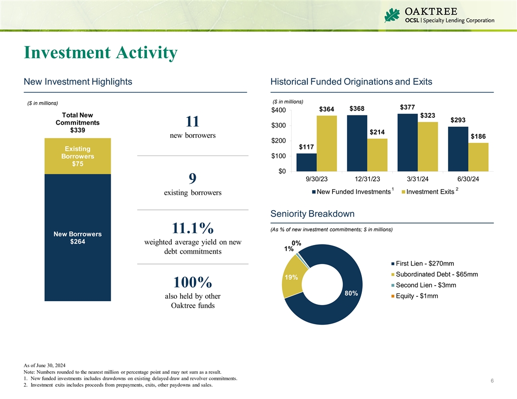 | | Originated $338.7 million of new investment commitments and received $185.5 million of proceeds from prepayments, exits, other paydowns and sales during the quarter ended June 30, 2024. The weighted average yield on new debt investments was 11.1%. |