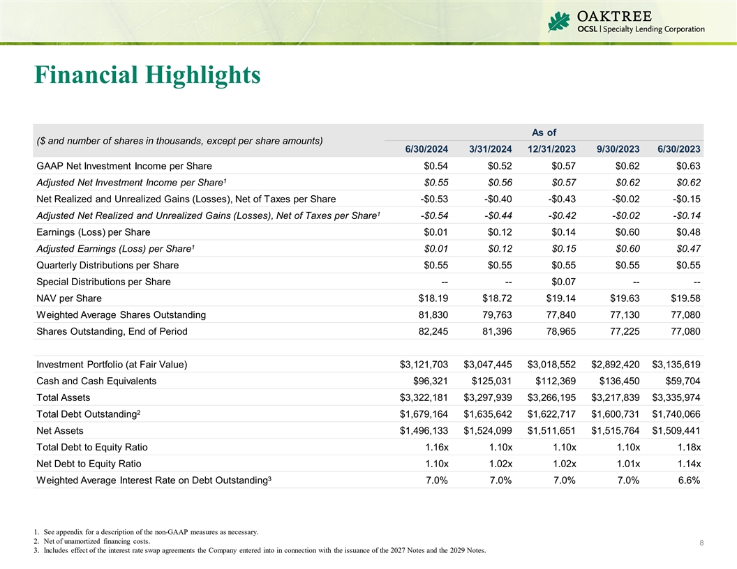 Investment Activity (continued) New Investment Commitment Detail ($ in millions) Security Type Market Investment Number of Unsecured Private Primary Secondary Avg. Secondary Fiscal Quarter First Lien Second Lien Commitments Deals & Other Placement (Public) (Public) Purchase Price 4Q2021 $385 20 $350 $13 $23 $304 $79 $2 100% 1Q2022 $300 21 $220 $77 $2 $227 $73 -- N/A 2Q2022 $228 25 $163 $17 $48 $162 $26 $40 96% 3Q2022 $132 28 $100 $6 $25 $63 $5 $63 91% 4Q2022 $97 11 $65 -- $32 $71 $22 $4 92% 1Q2023 $250 25 $214 $10 $26 $188 $49 $14 82% 2Q2023 $124 9 $124 -- -- $118 $5 $1 81% 3Q2023 $251 10 $227 $24 $0.2 $224 $20 $7 85% 4Q2023 $87 6 $87 -- -- $76 $12 -- N/A 1Q2024 $370 24 $354 -- $16 $302 -- $68 90% 2Q2024 $396 35 $364 -- $32 $205 $99 $92 98% 3Q2024 $339 20 $270 $3 $65 $256 $58 $24 97% 7 Note: Numbers may not sum due to rounding. Excludes any positions originated, purchased and sold within the same quarter and the assets acquired in the Oaktree Strategic Income II, Inc. (the “OSI2 Merger”).