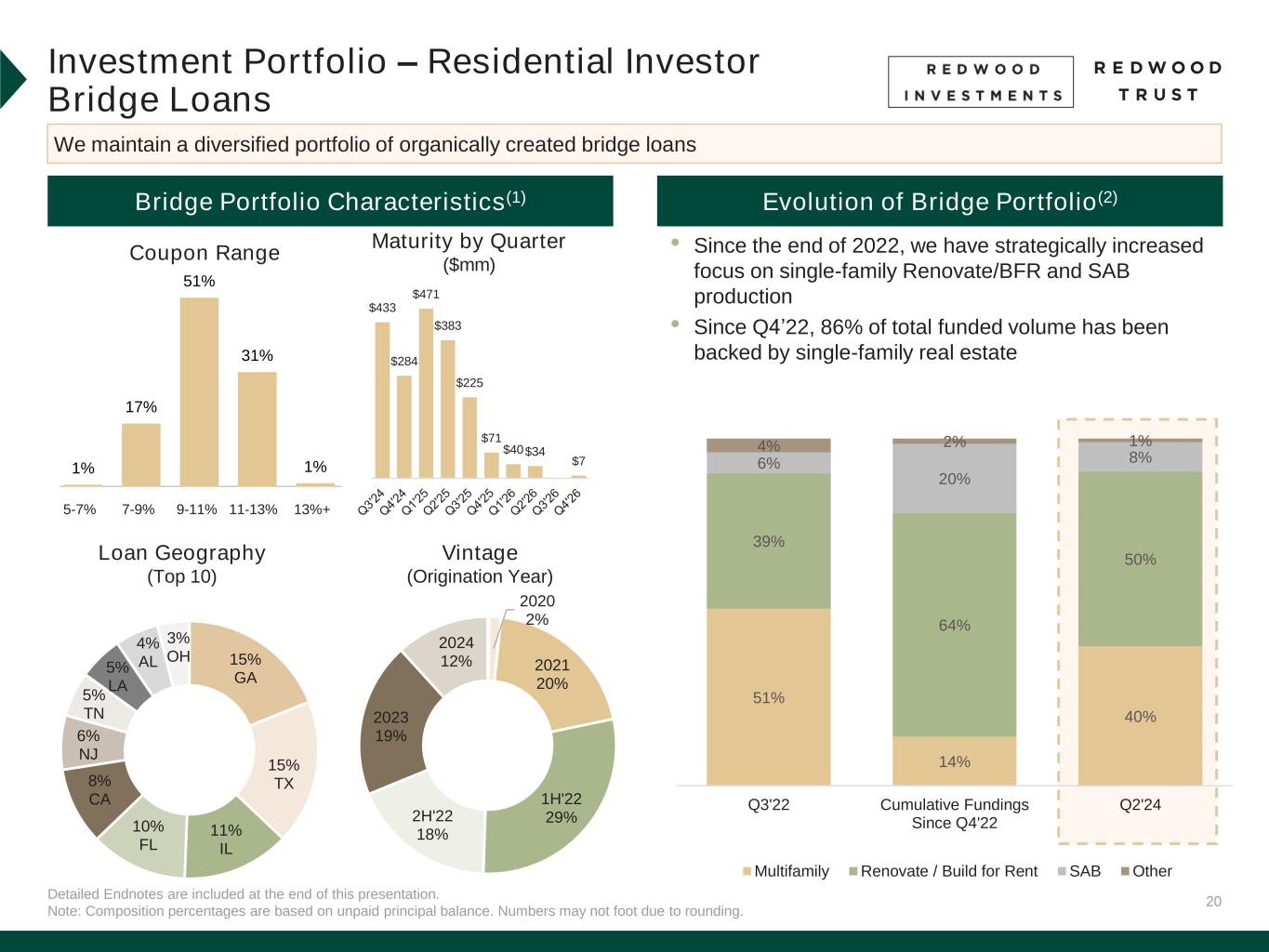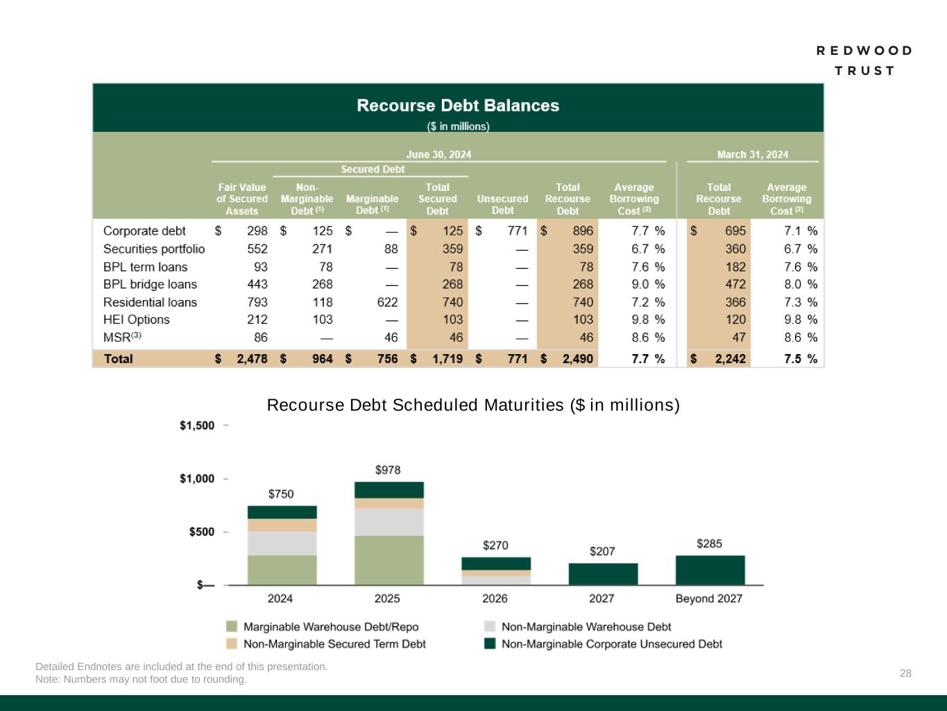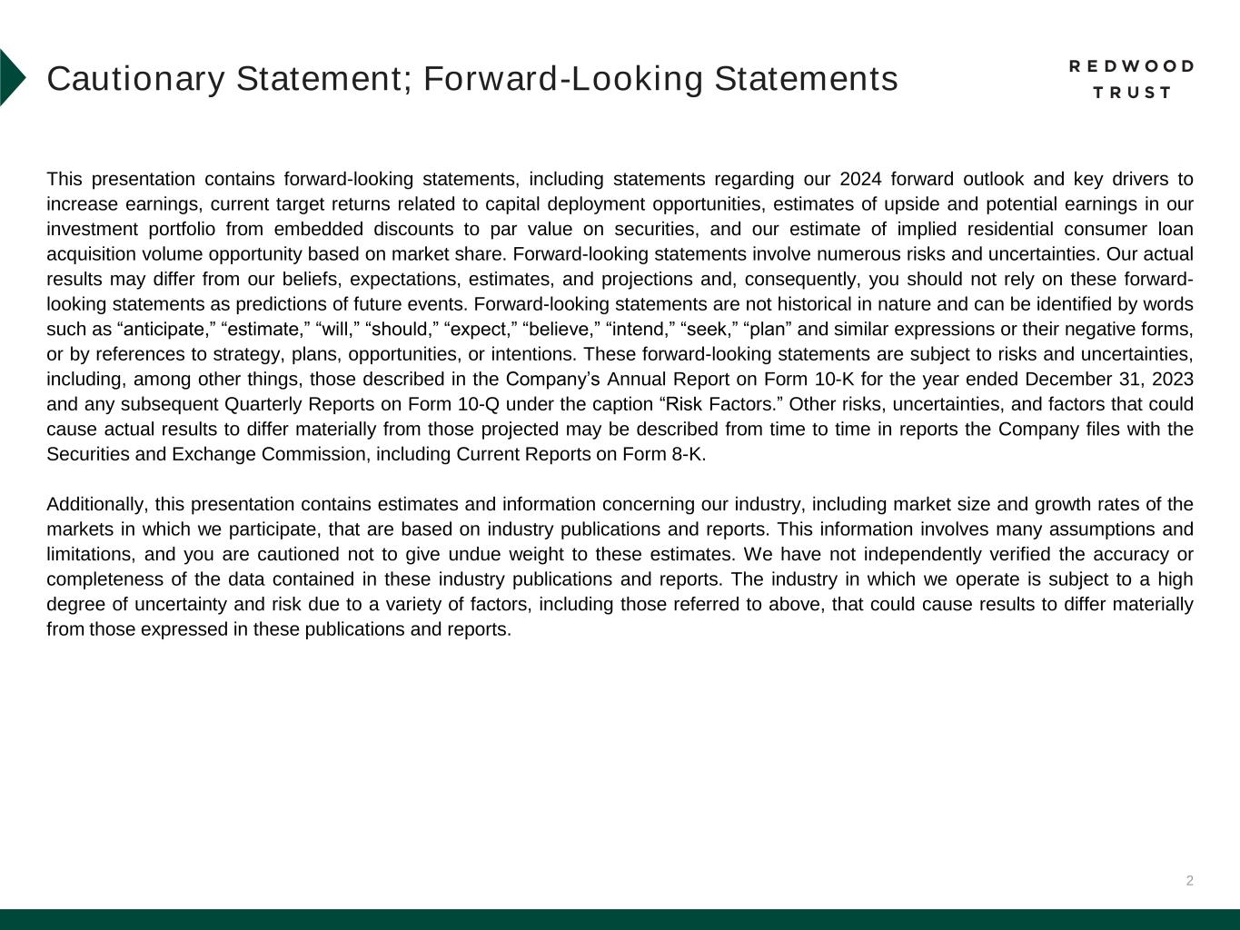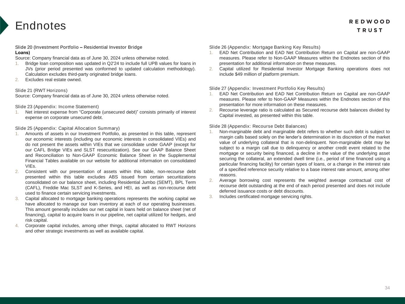 We file annual reports (on Form 10-K) and quarterly reports (on Form 10-Q) with the Securities and Exchange Commission. These filings, our Redwood Review presentation and our earnings press releases provide information about Redwood and our financial results in accordance with generally accepted accounting principles (GAAP). These documents, as well as information about our business and a glossary of terms we use in this and other publications, are available through our website, www.redwoodtrust.com. We encourage you to review these documents. Within this document, in addition to our GAAP results, we may also present certain non-GAAP measures. When we present a non-GAAP measure, we provide a description of that measure and a reconciliation to the comparable GAAP measure within the Non-GAAP Measures section of the Endnotes to the Redwood Review, which can be found on our website, www.redwoodtrust.com, under “Financials” within the “Investor Relations” section. References herein to “Redwood,” the “company,” “we,” “us,” and “our” include Redwood Trust, Inc., and its consolidated subsidiaries. Note that because we generally round numbers in the tables to millions, except per share amounts, some numbers may not foot due to rounding. References to the “second quarter” refer to the quarter ended June 30, 2024, the “first quarter” refer to the quarter ended March 31, 2024, and the “fourth quarter” refer to the quarter ended December 31, 2023, unless otherwise specified.