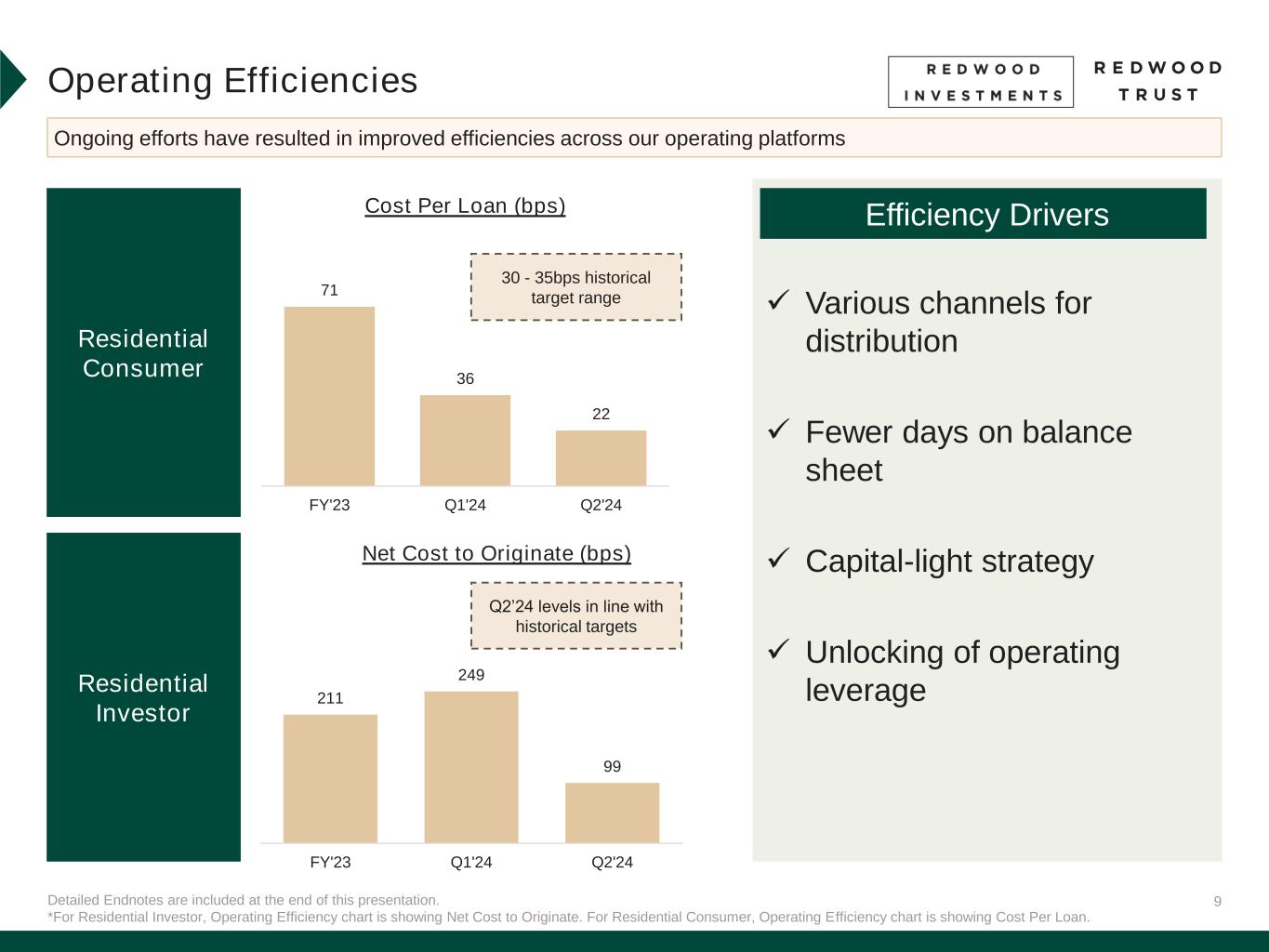 8 Detailed Endnotes are included at the end of this presentation. Strength of Operating Platforms Our operating platforms continue to achieve increased scale and distribution Volume Growth Distribution Strength Across all Channels $1,784 $2,664 Q1'24 Q2'24 Residential Consumer Residential Investor +49%+41% $1,389 $1,431 Q1'24 Q2'24 Residential Consumer Residential Investor Highest quarterly volume of non-securitization distributions 1H’24 securitization distribution volume has already surpassed FY’22 and FY’23 combined Figures $mm Figures $mm $326 $459 Q1'24 Q2'24 $59 $415 Q1'24 Q2'24 Highest volumes in ~2 years, driven by increase in term loan originations Highest volumes since the Fed began raising rates in early 2022
