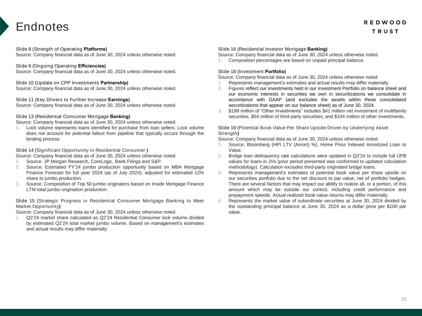 32 Slide 3 (Market Outlook Promotes Our Value Proposition) Source: Company financial data as of June 30, 2024 unless otherwise noted. Slide 4 (Our Products Serve Some of the Largest Addressable Markets in Housing Finance) Source: Company financial data as of June 30, 2024 unless otherwise noted. 1. Total Addressable Market Opportunity. Prospective Homeowners opportunity for Jumbo Lock Volume based on MBA Mortgage Finance Forecast for full year 2024 (as of July 2024), adjusted for estimated 12% share to jumbo production. Balance sheet opportunity for Jumbo Loan Sales based on quantity of jumbo loans held on bank balance sheets (Source: JP Morgan Research). Existing Homeowners opportunity based on total U.S. homeowner’s equity (Source: St. Louis Fed as of Q1’24). Housing Investors opportunity based on combined opportunity for SFR and Multifamily Rental. SFR based on June 2024 data and potential financing opportunity for SFR of $140 billion over 3-4 years (Source: John Burns Research and Consulting, LLC and internal Company estimates). Multifamily based on Freddie Mac 2024 multifamily origination estimate of $370 billion, adjusted for FNMA estimate of originations by non-traditional multifamily lenders. Portfolio Investors opportunity represents estimated investment opportunities across private label securities (“PLS”) subordinate securities, Credit Risk Transfer (“CRT”), HEI, Multifamily, Non-QM, NPL/RPL, Bridge and CAFL® SFR investments (Source: internal Company estimates). PropTech/Fin Tech opportunity based on capital invested in venture backed companies in the Mortgage Tech and Real Estate Technology verticals between June 30, 2023, and June 30, 2024 (Source: Pitchbook). Slide 5 (Redwood is a Full Spectrum Residential Housing Finance Platform) Source: Company financial data as of June 30, 2024 unless otherwise noted. Slide 6 (Q2’24 Financial Performance) Source: Company financial data as of June 30, 2024 unless otherwise noted. Market data per Bloomberg as of June 28, 2024. 1. Earnings Available for Distribution (“EAD”) is a non-GAAP measure. See slide in the Endnotes section of this presentation for additional information and reconciliation to GAAP net income. 2. Total economic return is based on the periodic change in GAAP book value per common share plus dividends declared per common share during the period, divided by beginning period GAAP book value per common share. 3. Indicative dividend yield based on RWT closing stock price of $6.49 on June 28, 2024. 4. Allocated capital includes working capital and platform premium for mortgage banking operations and all investments net of associated debt for investment portfolio. Capital allocation excludes corporate capital and RWT Horizons. Further detail on the components of allocated capital is included in the Financial Results section of this presentation. Single-Family Investment Portfolio capital allocation includes all capital allocated to the Investment Portfolio, including nominal amount of capital allocated to Freddie K-Series and CAFL securities with multifamily collateral and excluding capital allocated to Multifamily Bridge, which is depicted as its own sub-category on this chart. 5. EAD ROE is a non-GAAP metric. Please refer to Non-GAAP Measures in the Endnotes section of this presentation for additional information. 6. Recourse leverage ratio is defined as recourse debt at Redwood divided by tangible stockholders' equity. Recourse debt excludes $12.8 billion of consolidated securitization debt (ABS issued and servicer advance financing), other liabilities and other debt that is non-recourse to Redwood, and tangible stockholders' equity excludes $46.8 million of goodwill and intangible assets. Slide 7 (Q2’24 Business Performance) Source: Company financial data as of June 30, 2024 unless otherwise noted. 1. Lock volume represents loans identified for purchase from loan sellers. Lock volume does not account for potential fallout from pipeline that typically occurs through the lending process. 2. Includes Q3’24 activity through July 31, 2024. 3. Capital unlocked from re-securitization is subsequent to the repayment of existing associated debt. Endnotes