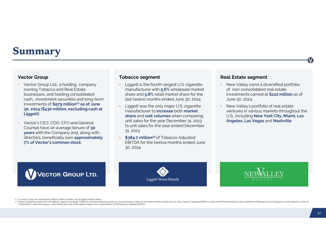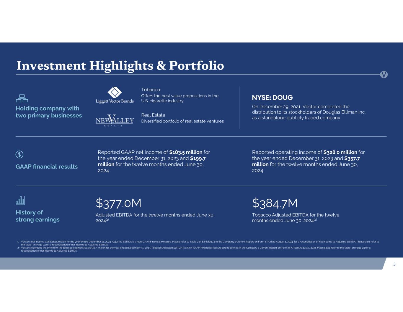 Disclaimer This document and any related oral presentation do not constitute an offer or invitation to subscribe for, purchase or otherwise acquire any equity or debt securities or other instruments of Vector Group Ltd. (“Vector,” “Vector Group” or the “Company”) or its subsidiaries and nothing contained herein or its presentation shall form the basis of any contract or commitment whatsoever. The distribution of this document and any related oral presentation in certain jurisdictions may be restricted by law and persons into whose possession this document or any related oral presentation comes should inform themselves about, and observe, any such restriction. Any failure to comply with these restrictions may constitute a violation of the laws of any such other jurisdiction. The information contained herein does not constitute investment, legal, accounting, regulatory, taxation or other advice and the information does not take into account your investment objectives or legal, accounting, regulatory, taxation or financial situation or particular needs. You are solely responsible for forming your own opinions and conclusions on such matters and the market and for making your own independent assessment of the information. The following presentation may contain "forward-looking statements,” including any statements that may be contained in the presentation that reflect Vector’s expectations or beliefs with respect to future events and financial performance. These forward-looking statements are subject to certain risks and uncertainties that could cause actual results to differ materially from those contained in any forward-looking statement made by or on behalf of the Company, including the risk that changes in Vector’s capital expenditures impact its expected free cash flow and the other risk factors described in Vector’s annual report on Form 10-K for the year ended December 31, 2023, as filed with the SEC, and Vector’s quarterly report on Form 10-Q for the quarterly period ended June 30, 2024. Please also refer to Vector's Current Reports on Form 8-K, filed on October 2, 2015, November 15, 2016, June 14, 2018, May 3, 2019, March 1, 2022, February 14, 2024, and May 2, 2024 (Commission File Number 1-5759) as filed with the SEC for information, including cautionary and explanatory language, relating to Non-GAAP Financial Measures in this presentation labeled "Adjusted". Results actually achieved may differ materially from expected results included in these forward-looking statements as a result of these or other factors. Due to such uncertainties and risks, potential investors are cautioned not to place undue reliance on such forward-looking statements, which speak only as of the date on which such statements are made. The Company disclaims any obligation to, and does not undertake to, update or revise and forward-looking statements in this presentation, except as required by applicable law. 2