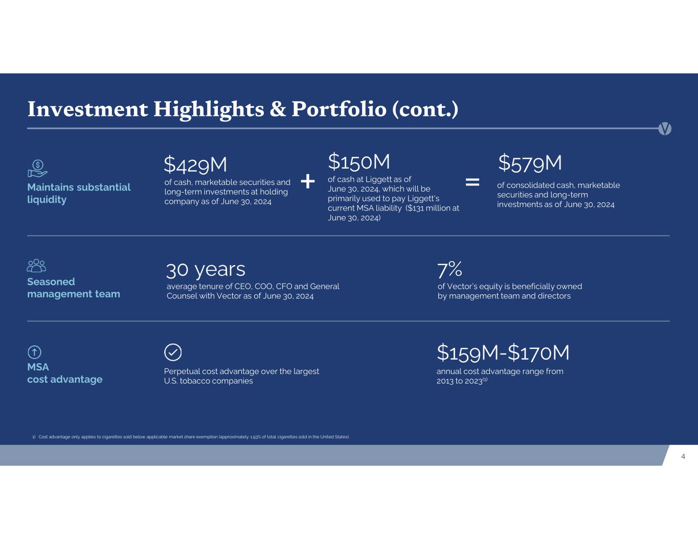 Investment Highlights & Portfolio 1) Vector’s net income was $183.5 million for the year ended December 31, 2023. Adjusted EBITDA is a Non-GAAP Financial Measure. Please refer to Table 2 of Exhibit 99.1 to the Company’s Current Report on Form 8-K, filed August 1, 2024, for a reconciliation of net income to Adjusted EBITDA. Please also refer to the table on Page 23 for a reconciliation of net income to Adjusted EBITDA. 2) Vector's operating income from the tobacco segment was $346.7 million for the year ended December 31, 2023. Tobacco Adjusted EBITDA is a Non-GAAP Financial Measure and is defined in the Company’s Current Report on Form 8-K, filed August 1, 2024. Please also refer to the table on Page 23 for a reconciliation of net income to Adjusted EBITDA. 3 Holding company with two primary businesses GAAP financial results History of strong earnings $377.0M Adjusted EBITDA for the twelve months ended June 30, 2024(1) $384.7M Tobacco Adjusted EBITDA for the twelve months ended June 30, 2024(2) Reported GAAP net income of $183.5 million for the year ended December 31, 2023 and $199.7 million for the twelve months ended June 30, 2024 Reported operating income of $328.0 million for the year ended December 31, 2023 and $357.7 million for the twelve months ended June 30, 2024 Tobacco Offers the best value propositions in the U.S. cigarette industry Real Estate Diversified portfolio of real estate ventures On December 29, 2021, Vector completed the distribution to its stockholders of Douglas Elliman Inc. as a standalone publicly traded company