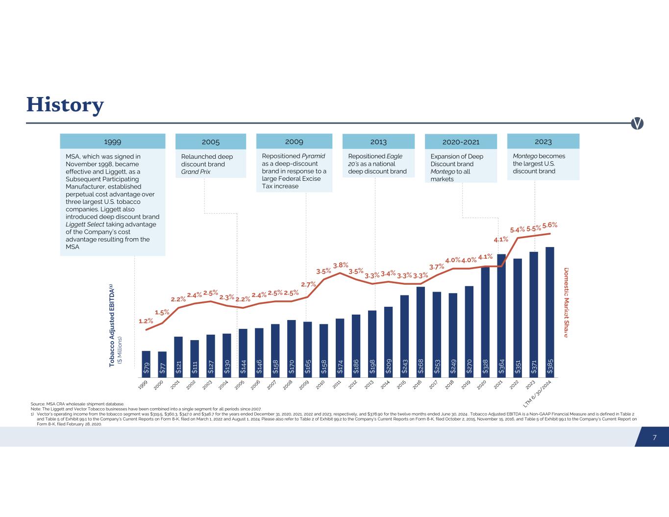 Consistent and strong cash flow Overview 6 4th largest U.S. cigarette manufacturer; founded in 1873 Core Discount Brands Montego, Eagle 20’s, Pyramid, Grand Prix, Liggett Select and Eve Average Retail Prices Below Leading Premium Brand 30% 10%50% Discount Category Momentum and growth for brands priced in the deep discount segment Approximately 35% of current volumes exempt from payment due to perpetual MSA grandfathered market share Partner Brands USA, Bronson and Tourney $384.7M Tobacco Adjusted EBITDA for the twelve months June 30, 2024 (1) $6.0M capital expenditures related to tobacco operations for the twelve months ended June 30, 2024, including factory modernization described below $13.4M current capital expenditure commitments, of which $9.7 million has been funded, associated with factory modernization in 2024. $0.95 (2) 2024 cost advantage per pack on first 1.93% of cigarettes sold in the United States compared to the largest U.S. tobacco companies Pursuant to the MSA Liggett has no payment obligations unless its market share exceeds an exemption of approximately 1.65% of total cigarettes sold in the United States, Vector Tobacco has no payment obligations unless its market share exceeds an exemption of approximately 0.28% of total cigarettes sold in the United States 1) Vector's operating income from the tobacco segment was $346.7 million for the year ended December 31, 2023 and $378.9 million for the twelve months ended June 30, 2024, respectively. Tobacco Adjusted EBITDA is a Non-GAAP Financial Measure and is defined in the Company’s Current Report on Form 8-K, filed May 2, 2024. Please also refer to the Disclaimer to this document on Page 2. 2) Cost advantage only applies to cigarettes sold below applicable market share exemption (approximately 1.93% of total cigarettes sold in the United States). $159M-$170M (2) MSA exemption annual cost advantage range for Liggett and Vector Tobacco from 2013 to 2023