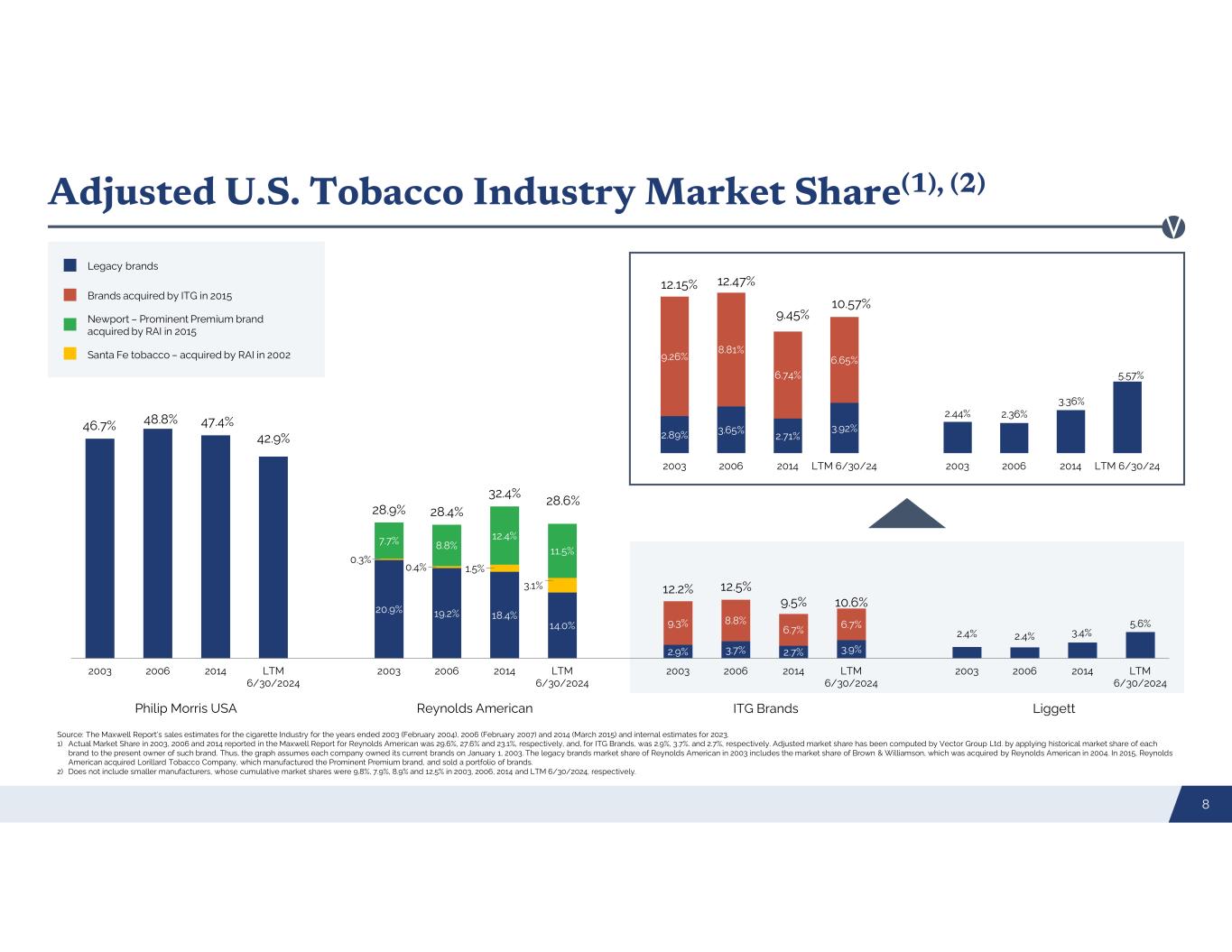 History Source: MSA CRA wholesale shipment database. Note: The Liggett and Vector Tobacco businesses have been combined into a single segment for all periods since 2007. 1) Vector’s operating income from the tobacco segment was $319.5, $360.3, $347.0 and $346.7 for the years ended December 31, 2020, 2021, 2022 and 2023, respectively, and $378.90 for the twelve months ended June 30, 2024 . Tobacco Adjusted EBITDA is a Non-GAAP Financial Measure and is defined in Table 2 and Table 5 of Exhibit 99.1 to the Company’s Current Reports on Form 8-K, filed on March 1, 2022 and August 1, 2024. Please also refer to Table 2 of Exhibit 99.2 to the Company’s Current Reports on Form 8-K, filed October 2, 2015, November 15, 2016, and Table 5 of Exhibit 99.1 to the Company's Current Report on Form 8-K, filed February 28, 2020. 7 T o b ac co A d ju st e d EB IT D A (1 ) ($ M ill io n s) D o m e stic M arke t S h are MSA, which was signed in November 1998, became effective and Liggett, as a Subsequent Participating Manufacturer, established perpetual cost advantage over three largest U.S. tobacco companies. Liggett also introduced deep discount brand Liggett Select taking advantage of the Company’s cost advantage resulting from the MSA 1999 Relaunched deep discount brand Grand Prix 2005 Repositioned Pyramid as a deep-discount brand in response to a large Federal Excise Tax increase 2009 Repositioned Eagle 20’s as a national deep discount brand 2013 Expansion of Deep Discount brand Montego to all markets 2020-2021 Montego becomes the largest U.S. discount brand 2023 $ 79 $ 77 $ 12 1 $ 11 1 $ 12 7 $ 13 0 $ 14 4 $ 14 6 $ 15 8 $ 17 0 $ 16 5 $ 15 8 $ 17 4 $ 18 6 $ 19 8 $ 20 9 $ 24 3 $ 26 8 $ 25 3 $ 24 9 $ 27 0 $ 32 8 $ 36 4 $ 35 1 $ 37 1 $ 38 5 1.2% 1.5% 2.2% 2.4% 2.5% 2.3% 2.2% 2.4% 2.5% 2.5% 2.7% 3.5% 3.8% 3.5% 3.3% 3.4% 3.3% 3.3% 3.7% 4.0%4.0% 4.1% 4.1% 5.4% 5.5% 5.6% -1% 0% 1% 2% 3% 4% 5% 6%