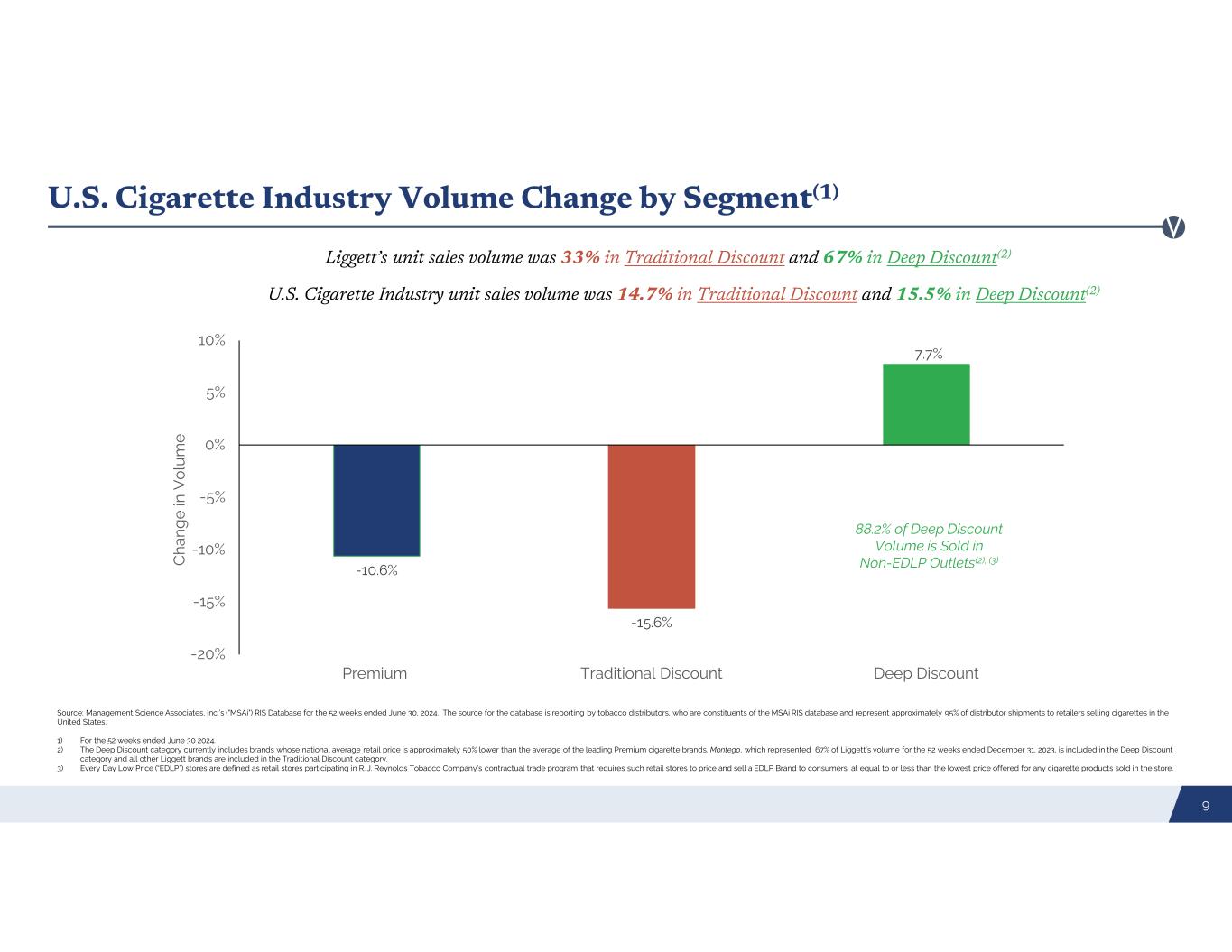 Adjusted U.S. Tobacco Industry Market Share(1), (2) Source: The Maxwell Report’s sales estimates for the cigarette Industry for the years ended 2003 (February 2004), 2006 (February 2007) and 2014 (March 2015) and internal estimates for 2023. 1) Actual Market Share in 2003, 2006 and 2014 reported in the Maxwell Report for Reynolds American was 29.6%, 27.6% and 23.1%, respectively, and, for ITG Brands, was 2.9%, 3.7%. and 2.7%, respectively. Adjusted market share has been computed by Vector Group Ltd. by applying historical market share of each brand to the present owner of such brand. Thus, the graph assumes each company owned its current brands on January 1, 2003. The legacy brands market share of Reynolds American in 2003 includes the market share of Brown & Williamson, which was acquired by Reynolds American in 2004. In 2015, Reynolds American acquired Lorillard Tobacco Company, which manufactured the Prominent Premium brand, and sold a portfolio of brands. 2) Does not include smaller manufacturers, whose cumulative market shares were 9.8%, 7.9%, 8.9% and 12.5% in 2003, 2006, 2014 and LTM 6/30/2024, respectively. 8 46.7% 48.8% 47.4% 42.9% 20.9% 19.2% 18.4% 14.0% 2.9% 3.7% 2.7% 3.9% 2.4% 2.4% 3.4% 5.6% 0.3% 0.4% 1.5% 3.1% 7.7% 8.8% 12.4% 11.5% 9.3% 8.8% 6.7% 6.7% 2003 2006 2014 LTM 6/30/2024 2003 2006 2014 LTM 6/30/2024 2003 2006 2014 LTM 6/30/2024 2003 2006 2014 LTM 6/30/2024 28.9% 28.4% 32.4% 28.6% Philip Morris USA Reynolds American Liggett 2.89% 3.65% 2.71% 3.92% 2.44% 2.36% 3.36% 5.57% 9.26% 8.81% 6.74% 6.65% 2003 2006 2014 LTM 6/30/24 2003 2006 2014 LTM 6/30/24 12.15% 12.47% 9.45% 10.57% 12.2% 12.5% 9.5% 10.6% Newport – Prominent Premium brand acquired by RAI in 2015 Brands acquired by ITG in 2015 Legacy brands Santa Fe tobacco – acquired by RAI in 2002 ITG Brands