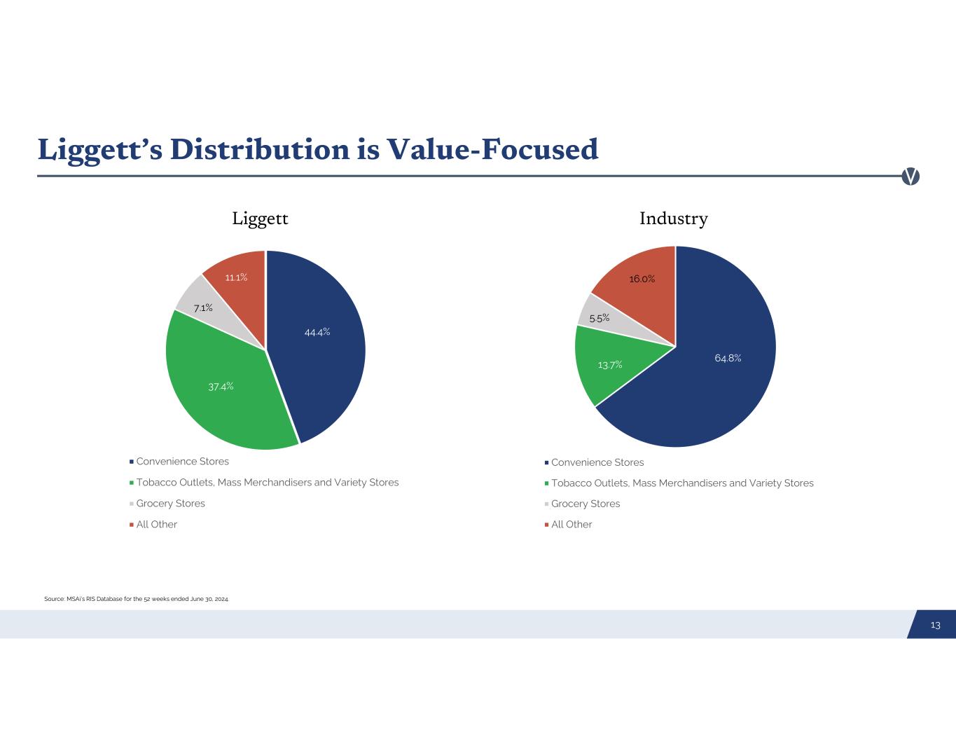 Average per Pack Price (Retail)–EDLP Stores(1) and Non-EDLP(1), (2) Stores 12 $9.22 $5.71 $8.32 $7.17 N/A $9.31 $6.80 $8.27 $6.87 $5.06 $0.00 $1.00 $2.00 $3.00 $4.00 $5.00 $6.00 $7.00 $8.00 $9.00 $10.00 Largest Premium Brand Prominent Discount Brand Relaunched In 2021 Pyramid Eagle 20's Montego (Largest Discount Brand) A ve ra g e P ac k P ric e EDLP Non-EDLP (1), (2) (1), (2) Source: Company estimates in Liggett's markets for the 13 weeks ended June 30, 2024. 1) EDLP stores are defined as retail stores participating in R. J. Reynolds Tobacco Company’s contractual trade program that requires such retail stores to price and sell an EDLP Brand to consumers, at equal to or less than the lowest price offered for any cigarette products sold in the store. 2) Company retail pricing estimates include State Excise Tax and, as such, average brand pricing estimates maybe impacted by the degree of geographic diversity in the retail store population sample.