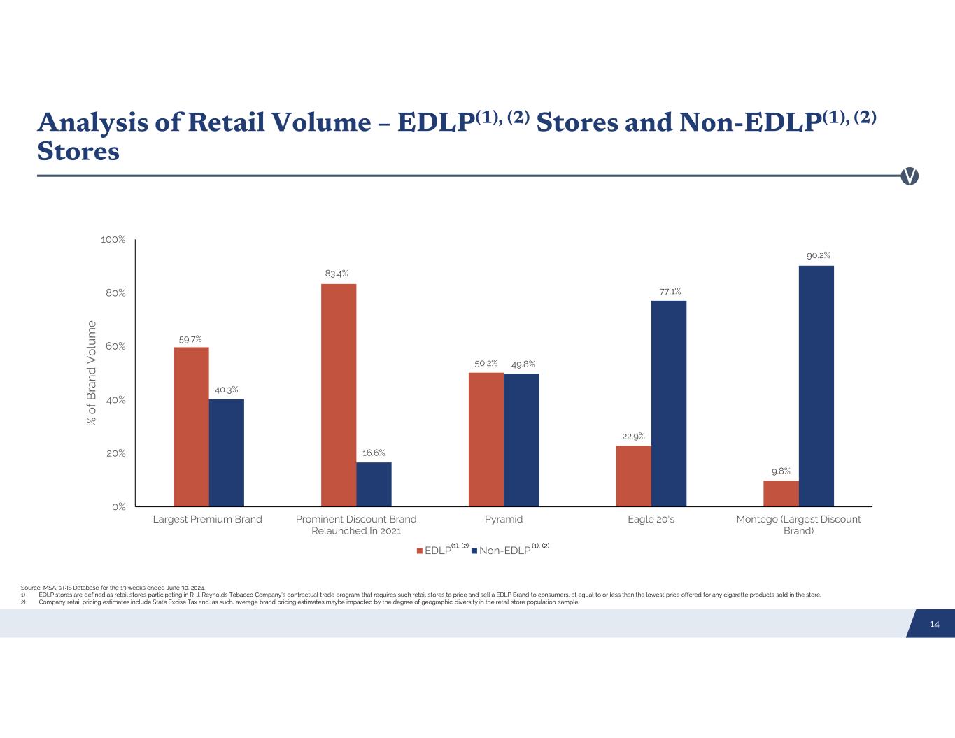 Liggett’s Distribution is Value-Focused 13 44.4% 37.4% 7.1% 11.1% Convenience Stores Tobacco Outlets, Mass Merchandisers and Variety Stores Grocery Stores All Other 64.8% 13.7% 5.5% 16.0% Convenience Stores Tobacco Outlets, Mass Merchandisers and Variety Stores Grocery Stores All Other Liggett Industry Source: MSAi’s RIS Database for the 52 weeks ended June 30, 2024.