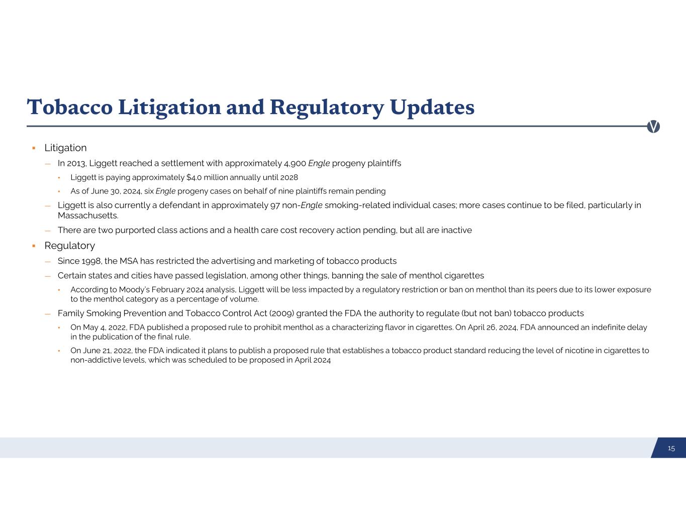 Tobacco Litigation and Regulatory Updates Litigation — In 2013, Liggett reached a settlement with approximately 4,900 Engle progeny plaintiffs • Liggett is paying approximately $4.0 million annually until 2028 • As of June 30, 2024, six Engle progeny cases on behalf of nine plaintiffs remain pending — Liggett is also currently a defendant in approximately 97 non-Engle smoking-related individual cases; more cases continue to be filed, particularly in Massachusetts. — There are two purported class actions and a health care cost recovery action pending, but all are inactive Regulatory — Since 1998, the MSA has restricted the advertising and marketing of tobacco products — Certain states and cities have passed legislation, among other things, banning the sale of menthol cigarettes • According to Moody’s February 2024 analysis, Liggett will be less impacted by a regulatory restriction or ban on menthol than its peers due to its lower exposure to the menthol category as a percentage of volume. — Family Smoking Prevention and Tobacco Control Act (2009) granted the FDA the authority to regulate (but not ban) tobacco products • On May 4, 2022, FDA published a proposed rule to prohibit menthol as a characterizing flavor in cigarettes. On April 26, 2024, FDA announced an indefinite delay in the publication of the final rule. • On June 21, 2022, the FDA indicated it plans to publish a proposed rule that establishes a tobacco product standard reducing the level of nicotine in cigarettes to non-addictive levels, which was scheduled to be proposed in April 2024 15