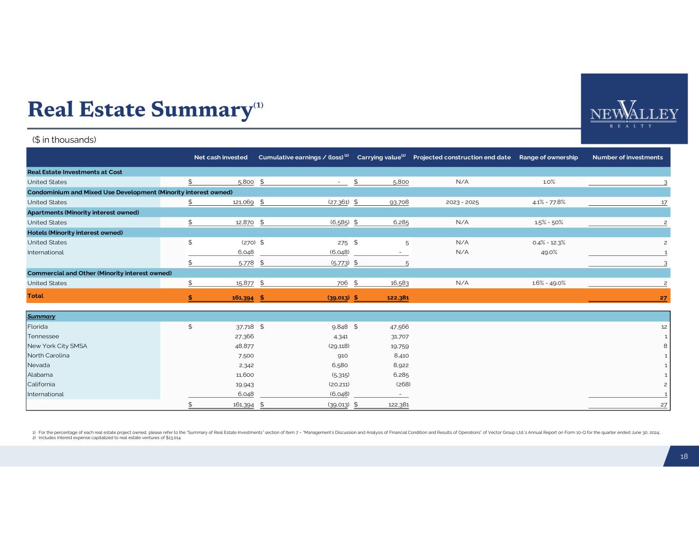 Real Estate Overview New Valley LLC owns interests in real estate ventures operating in different asset classes, including condominium and mixed-use developments, apartment buildings, hotels and commercial properties New Valley has approximately $174 million(1) invested, as of June 30, 2024, in a broad portfolio of real estate ventures On December 29, 2021, Vector completed the distribution to its stockholders of Douglas Elliman Inc. as a standalone public company. Douglas Elliman Inc. (NYSE: DOUG) owns the real estate brokerage, ancillary services operations and PropTech investment businesses formerly owned by Vector through New Valley. New Valley’s interest in numerous real estate properties and projects remain owned by Vector. 1) Net of cash returned. 17