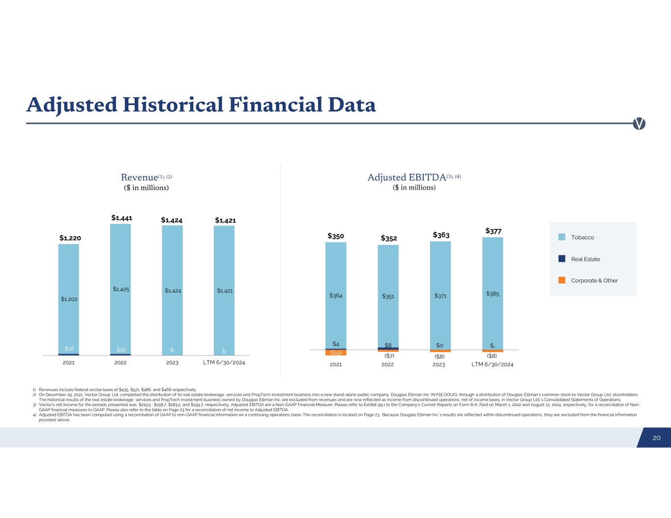 Adjusted EBITDA Reconciliation Source: Company filings. 1) Represents income recognized from changes in the fair value of the derivatives embedded in the Company’s convertible debt. 2) Represents equity in earnings recognized from investments that the Company accounts for under the equity method. 3) Represents equity in (earnings) losses recognized from the Company’s investment in certain real estate businesses that are not consolidated in its financial results. 4) Represents amortization of stock-based compensation. 5) Represents accruals for litigation in the tobacco segment.. 6) Represents the tobacco segment's settlement of a long-standing dispute related to the Master Settlement Agreement. 7) Transaction expenses include expenses incurred in connection with the Company’s spin-off of Douglas Elliman Inc. into a standalone, public company, which occurred on December 29, 2021. 8) Some numbers may not add due to rounding 23 ($ Millions) ($ Millions) 2021 2022 2023 6/30/2024 6/30/2023 LTM 6/30/2024 Net income attributed to Vector Group Ltd. 219.5$ 158.7$ 183.5$ 89.0$ 72.8$ 199.7$ Net (income) loss attributed to Vector Group Ltd. from discontinued operations (72.1) - - - - - Interest Expense 112.7 110.7 108.6 54.0 54.6 108.1 Tax Expense 62.8 61.9 64.9 34.1 28.6 70.4 Net loss attributed to non-controlling interest (0.2) - - - - - Depreciation and Amortization 7.8 7.2 7.0 3.3 3.4 6.8 EBITDA 330.5$ 338.5$ 364.0$ 180.4$ 159.4$ 385.0$ Change in Fair Value of Derivatives Embedded Within Convertible Debt (1) - - - - - - Equity in (Earnings) Loss from Investments(2) (2.7) 5.0 (1.3) (1.5) (0.8) (2.0) Equity in (Earnings) Losses from Real Estate Ventures(3) (10.3) 5.9 (2.2) 11.9 (1.1) 10.8 Loss (gain) on extinguishment of debt 21.4 (0.4) 0.5 - 0.2 0.4 Stock-Based compensation expense (4) 14.8 7.8 10.1 7.1 4.8 12.5 Litigation settlement and judgment expense (5) 0.2 0.2 18.8 0.3 18.4 0.7 (6) (2.7) (2.1) (0.7) (0.2) (0.3) (0.6) 10.5 - - - - - Net gains on sales of assets (0.9) - - - - - Other, net (10.7) (2.7) (26.0) (12.0) (8.4) (29.8) Adjusted EBITDA Attributed to Vector 350.1$ 352.2$ 363.2$ 186.0$ 172.2$ 377.0$ Operating Income (Loss) by Segment Tobacco 360.3$ 347.0$ 346.7$ 185.9$ 153.7$ 378.9$ Real Estate 4.1 8.0 0.3 (0.1) 0.2 - Corporate & Other (43.9) (16.0) (19.0) (10.3) (8.0) (21.2) Operating Income 320.4$ 339.0$ 328.0$ 175.6$ 145.9$ 357.7$ Adjusted EBITDA Attributed to Vector by Segment Tobacco 364.4$ 351.1$ 370.6$ 188.8$ 174.7$ 384.7$ Real Estate 4.3 8.1 0.3 (0.1) 0.2 - Corporate & Other (18.6) (7.0) (7.7) (2.7) (2.7) (7.7) Adjusted EBITDA Attributed to Vector 350.1$ 352.2$ 363.2$ 186.0$ 172.2$ 377.0$