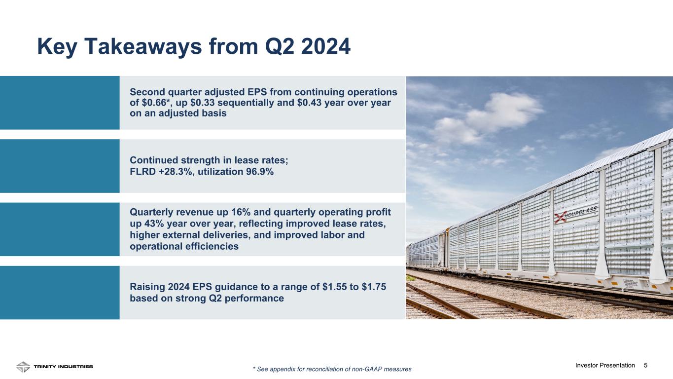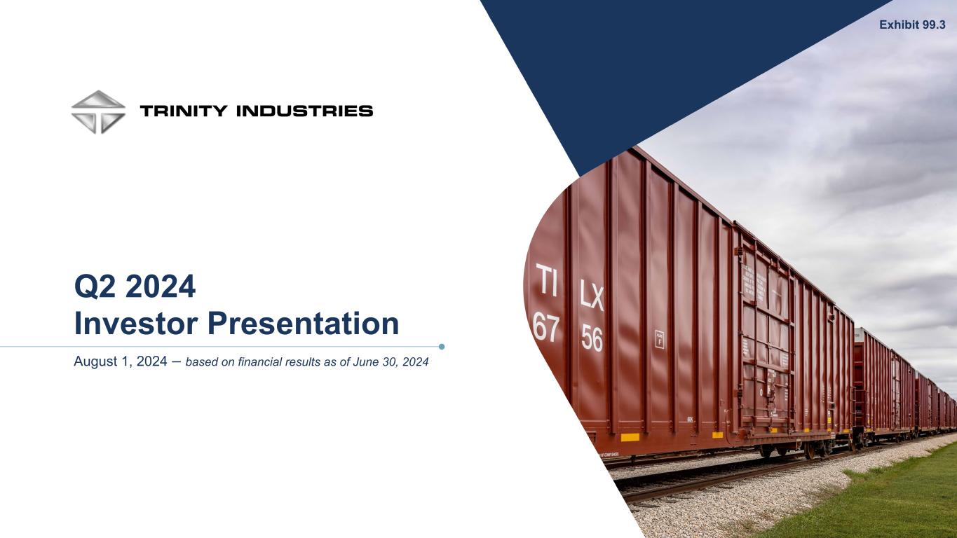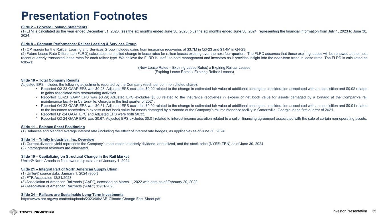 35Investor Presentation Slide 2 – Forward Looking Statements (1) LTM is calculated as the year ended December 31, 2023, less the six months ended June 30, 2023, plus the six months ended June 30, 2024, representing the financial information from July 1, 2023 to June 30, 2024. Slide 8 – Segment Performance: Railcar Leasing & Services Group (1) OP margin for the Railcar Leasing and Services Group includes gains from insurance recoveries of $3.7M in Q3-23 and $1.4M in Q4-23. (2) Future Lease Rate Differential (FLRD) calculates the implied change in lease rates for railcar leases expiring over the next four quarters. The FLRD assumes that these expiring leases will be renewed at the most recent quarterly transacted lease rates for each railcar type. We believe the FLRD is useful to both management and investors as it provides insight into the near-term trend in lease rates. The FLRD is calculated as follows: (New Lease Rates – Expiring Lease Rates) x Expiring Railcar Leases (Expiring Lease Rates x Expiring Railcar Leases) Slide 10 – Total Company Results Adjusted EPS includes the following adjustments reported by the Company (each per common diluted share): • Reported Q2-23 GAAP EPS was $0.23; Adjusted EPS excludes $0.02 related to the change in estimated fair value of additional contingent consideration associated with an acquisition and $0.02 related to gains associated with restructuring activities. • Reported Q3-23 GAAP EPS was $0.29; Adjusted EPS excludes $0.03 related to the insurance recoveries in excess of net book value for assets damaged by a tornado at the Company’s rail maintenance facility in Cartersville, Georgia in the first quarter of 2021. • Reported Q4-23 GAAP EPS was $0.81; Adjusted EPS excludes $0.02 related to the change in estimated fair value of additional contingent consideration associated with an acquisition and $0.01 related to the insurance recoveries in excess of net book value for assets damaged by a tornado at the Company’s rail maintenance facility in Cartersville, Georgia in the first quarter of 2021. • Reported Q1-24 GAAP EPS and Adjusted EPS were both $0.33. • Reported Q2-24 GAAP EPS was $0.67; Adjusted EPS excludes $0.01 related to interest income accretion related to a seller-financing agreement associated with the sale of certain non-operating assets. Slide 11 – Balance Sheet Positioning (1) Balances and blended average interest rate (including the effect of interest rate hedges, as applicable) as of June 30, 2024 Slide 14 – Trinity Industries, Inc. Overview (1) Current dividend yield represents the Company’s most recent quarterly dividend, annualized, and the stock price (NYSE: TRN) as of June 30, 2024. (2) Intersegment revenues are eliminated. Slide 19 – Capitalizing on Structural Change in the Rail Market Umler® North American fleet ownership data as of January 1, 2024 Slide 21 – Integral Part of North American Supply Chain (1) Umler® source data, January 1, 2024 report (2) FTR Associates 12/31/2023 (3) Association of American Railroads (“AAR”), accessed on March 1, 2022 with data as of February 20, 2022 (4) Association of American Railroads (“AAR”) 12/31/2023 Slide 24 – Railcars are Sustainable Long-Term Investments https://www.aar.org/wp-content/uploads/2023/06/AAR-Climate-Change-Fact-Sheet.pdf Presentation Footnotes