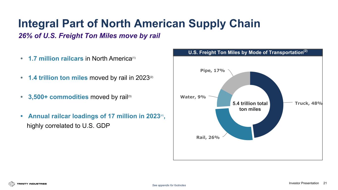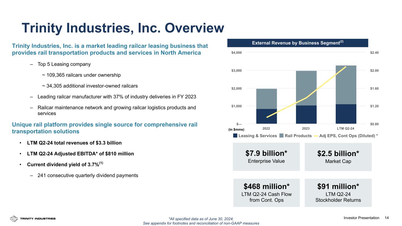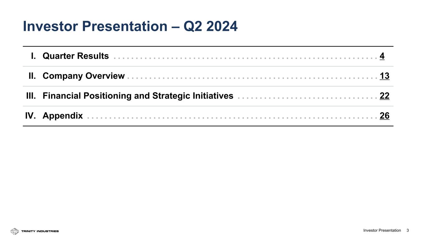 2Investor Presentation 2 Forward Looking Statements Some statements in this presentation, which are not historical facts, are “forward-looking statements” as defined by the Private Securities Litigation Reform Act of 1995. Forward-looking statements include statements about Trinity's estimates, expectations, beliefs, intentions or strategies for the future, and the assumptions underlying these forward-looking statements, including, but not limited to, future financial and operating performance, future opportunities and any other statements regarding events or developments that Trinity believes or anticipates will or may occur in the future. Trinity uses the words “anticipates,” “assumes,” “believes,” “estimates,” “expects,” “intends,” “forecasts,” “may,” “will,” “should,” “guidance,” “projected,” “outlook,” and similar expressions to identify these forward-looking statements. Forward-looking statements speak only as of the date of this material, and Trinity expressly disclaims any obligation or undertaking to disseminate any updates or revisions to any forward-looking statement contained herein to reflect any change in Trinity’s expectations with regard thereto or any change in events, conditions or circumstances on which any such statement is based, except as required by federal securities laws. Forward-looking statements involve risks and uncertainties that could cause actual results to differ materially from historical experience or our present expectations, including but not limited to risks and uncertainties regarding economic, competitive, governmental, and technological factors affecting Trinity’s operations, markets, products, services and prices, and such forward-looking statements are not guarantees of future performance. For a discussion of such risks and uncertainties, which could cause actual results to differ from those contained in the forward-looking statements, see “Risk Factors” and “Forward-Looking Statements” in Trinity’s Annual Report on Form 10-K for the most recent fiscal year, as may be revised and updated by Trinity’s Quarterly Reports on Form 10-Q, and Trinity’s Current Reports on Form 8-K. This presentation also includes references to calculations that are not based on generally accepted accounting principles (“GAAP”). Reconciliations of each of these non-GAAP measures to the most directly comparable GAAP measures have been included in the Appendix. When forward-looking non-GAAP measures are provided, Trinity does not provide quantitative reconciliations of forward-looking non-GAAP measures to the most directly comparable GAAP measures because it cannot, without unreasonable effort, predict the timing and amounts of certain items included in the computations of each of these measures. These factors include, but are not limited to: the product mix of expected railcar deliveries; the timing and amount of significant transactions and investments, such as lease portfolio sales, capital expenditures, and returns of capital to shareholders; and the amount and timing of certain other items outside the normal course of our core business operations. Except where noted, financial data is presented as of the Company’s most recent fiscal quarter ending June 30, 2024. “LTM” represents Last Twelve Months(1) financial information from July 1, 2023 to June 30, 2024. See appendix for footnotes