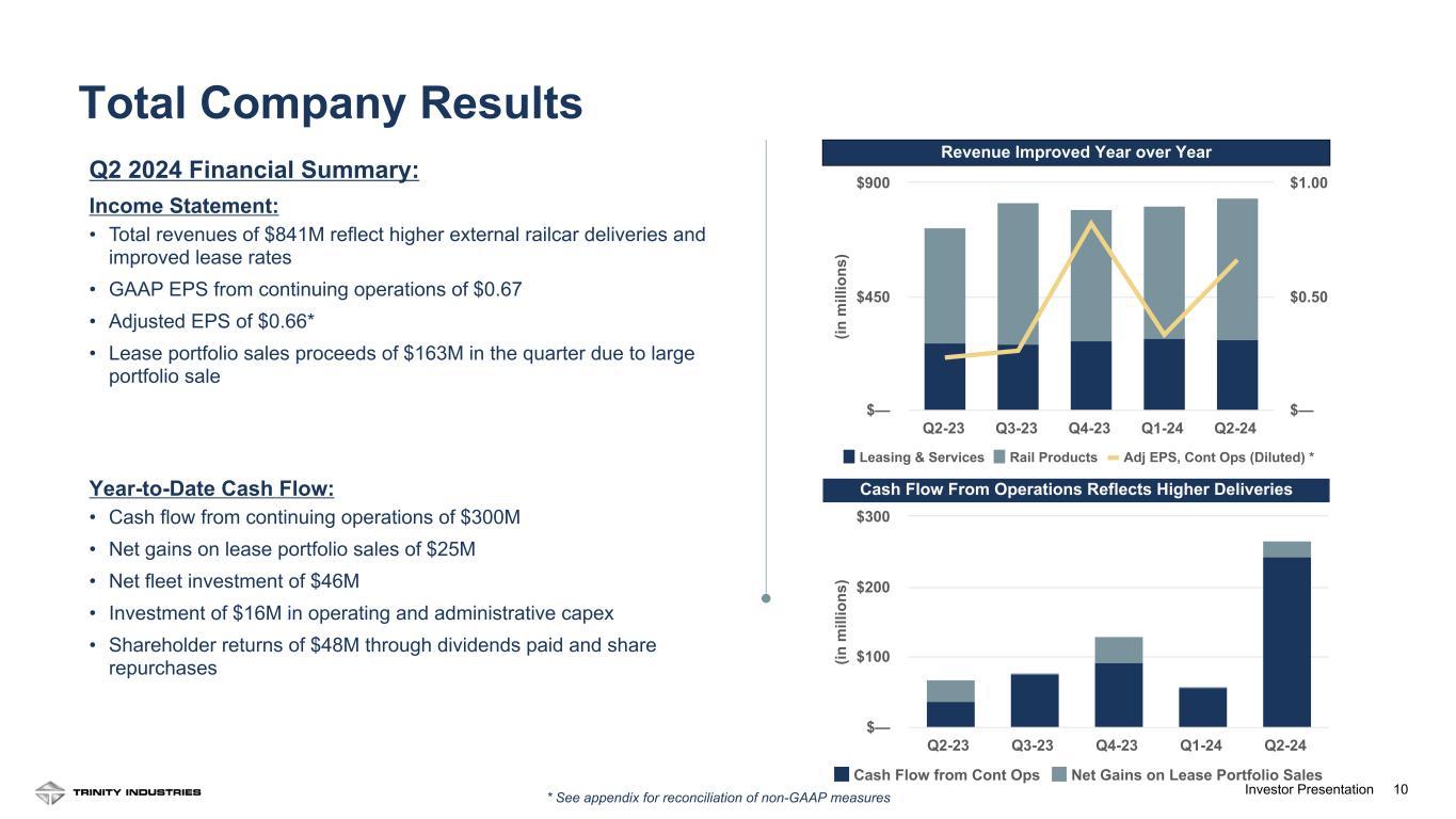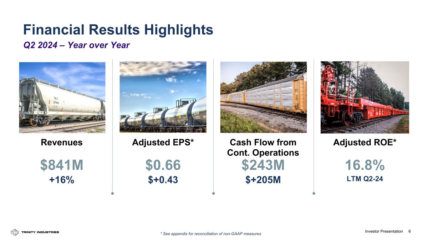 “Our second quarter GAAP EPS of $0.67 and adjusted EPS of $0.66 represent improvement across our business. Revenues are up 16% year over year, we generated $243 million of cash flow from continuing operations, and our LTM Adjusted ROE of 16.8% showcases the strength of our operations as well as our balance sheet,” said Trinity’s Chief Executive Officer and President, Jean Savage. “At our Investor Day in June, we highlighted the strength of our platform, and our second quarter results display significant progress toward our financial targets.”