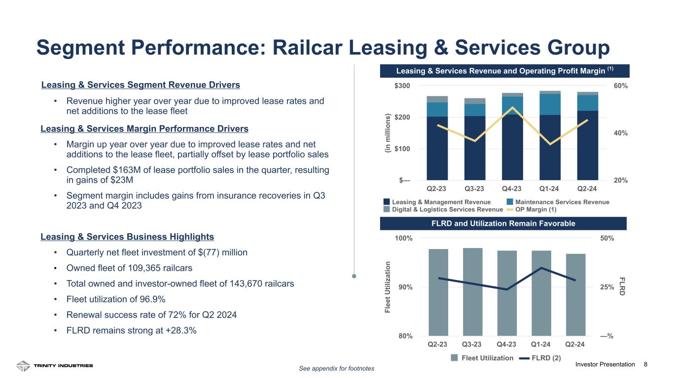 Second, on our 2023 fourth quarter call, we stated that we expect about 20 to 25% of our deliveries to go into our lease fleet for 2024. In the second quarter, that was about 10% due to the timing and planning of our manufacturing and delivery schedule. This benefited our quarterly earnings in the second quarter due to lower revenue and profit eliminations. We expect a higher percentage of deliveries going into our lease fleet the second half of the year. This is in support of our fleet investment goals and our conviction in the returns we will achieve by leasing these railcars instead of selling them new.