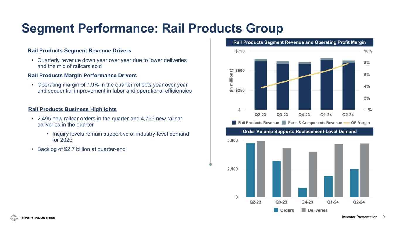 Moving to our Rail Products business, which supports our lease fleet and includes railcar manufacturing and our aftermarket parts business, I am pleased with our substantial progress, especially in labor and operational efficiencies. Our operating margin of 7.9% in the second quarter is up significantly both sequentially and year over year and is at the higher end of our full year guidance of 6 to 8 percent.
