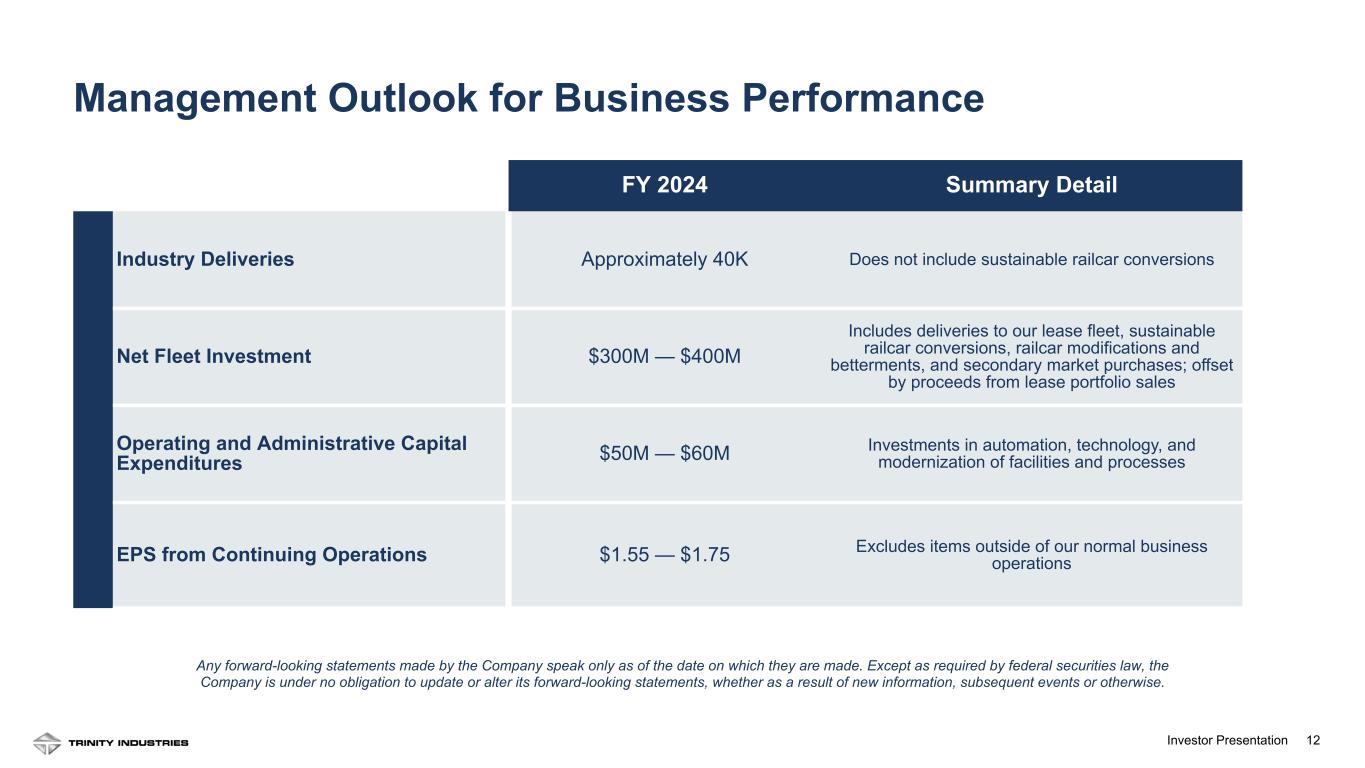 12Investor Presentation C ap ita l A llo ca tio n FY 2024 Summary Detail Industry Deliveries Approximately 40K Does not include sustainable railcar conversions Net Fleet Investment $300M — $400M Includes deliveries to our lease fleet, sustainable railcar conversions, railcar modifications and betterments, and secondary market purchases; offset by proceeds from lease portfolio sales Operating and Administrative Capital Expenditures $50M — $60M Investments in automation, technology, and modernization of facilities and processes EPS from Continuing Operations $1.55 — $1.75 Excludes items outside of our normal business operations Any forward-looking statements made by the Company speak only as of the date on which they are made. Except as required by federal securities law, the Company is under no obligation to update or alter its forward-looking statements, whether as a result of new information, subsequent events or otherwise. Management Outlook for Business Performance