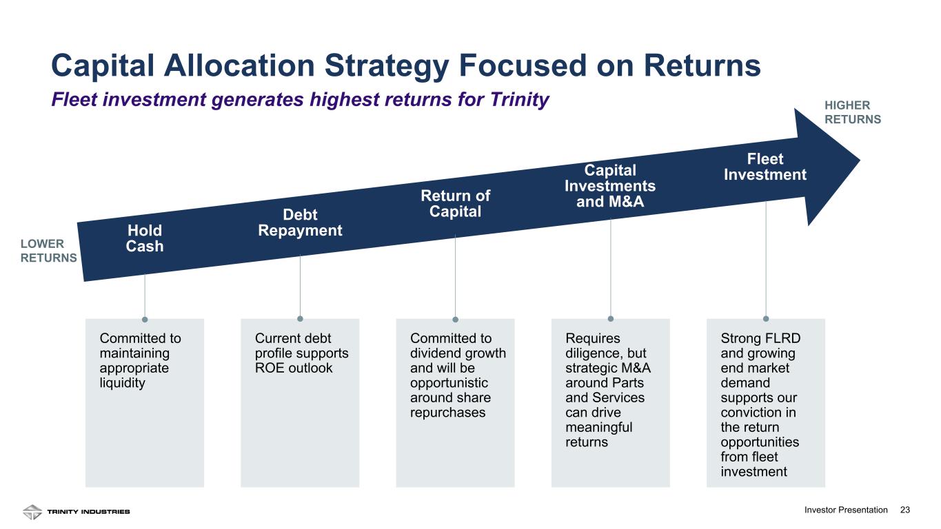 23Investor Presentation Fleet investment generates highest returns for Trinity Strong FLRD and growing end market demand supports our conviction in the return opportunities from fleet investment Requires diligence, but strategic M&A around Parts and Services can drive meaningful returns Committed to dividend growth and will be opportunistic around share repurchases Current debt profile supports ROE outlook Committed to maintaining appropriate liquidity Capital Allocation Strategy Focused on Returns HIGHER RETURNS LOWER RETURNS Fleet InvestmentCapital Investments and M&AReturn of CapitalDebt RepaymentHold Cash