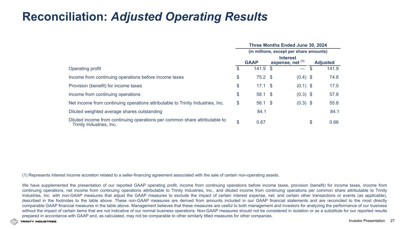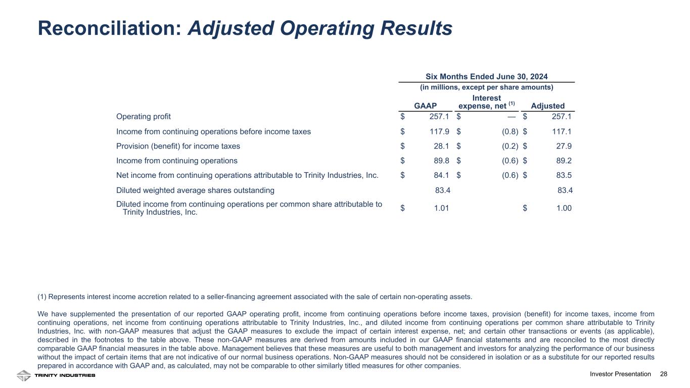 27Investor Presentation 27 Three Months Ended June 30, 2024 (in millions, except per share amounts) GAAP Interest expense, net (1) Adjusted Operating profit $ 141.9 $ — $ 141.9 Income from continuing operations before income taxes $ 75.2 $ (0.4) $ 74.8 Provision (benefit) for income taxes $ 17.1 $ (0.1) $ 17.0 Income from continuing operations $ 58.1 $ (0.3) $ 57.8 Net income from continuing operations attributable to Trinity Industries, Inc. $ 56.1 $ (0.3) $ 55.8 Diluted weighted average shares outstanding 84.1 84.1 Diluted income from continuing operations per common share attributable to Trinity Industries, Inc. $ 0.67 $ 0.66 (1) Represents interest income accretion related to a seller-financing agreement associated with the sale of certain non-operating assets. We have supplemented the presentation of our reported GAAP operating profit, income from continuing operations before income taxes, provision (benefit) for income taxes, income from continuing operations, net income from continuing operations attributable to Trinity Industries, Inc., and diluted income from continuing operations per common share attributable to Trinity Industries, Inc. with non-GAAP measures that adjust the GAAP measures to exclude the impact of certain interest expense, net; and certain other transactions or events (as applicable), described in the footnotes to the table above. These non-GAAP measures are derived from amounts included in our GAAP financial statements and are reconciled to the most directly comparable GAAP financial measures in the table above. Management believes that these measures are useful to both management and investors for analyzing the performance of our business without the impact of certain items that are not indicative of our normal business operations. Non-GAAP measures should not be considered in isolation or as a substitute for our reported results prepared in accordance with GAAP and, as calculated, may not be comparable to other similarly titled measures for other companies. Reconciliation: Adjusted Operating Results