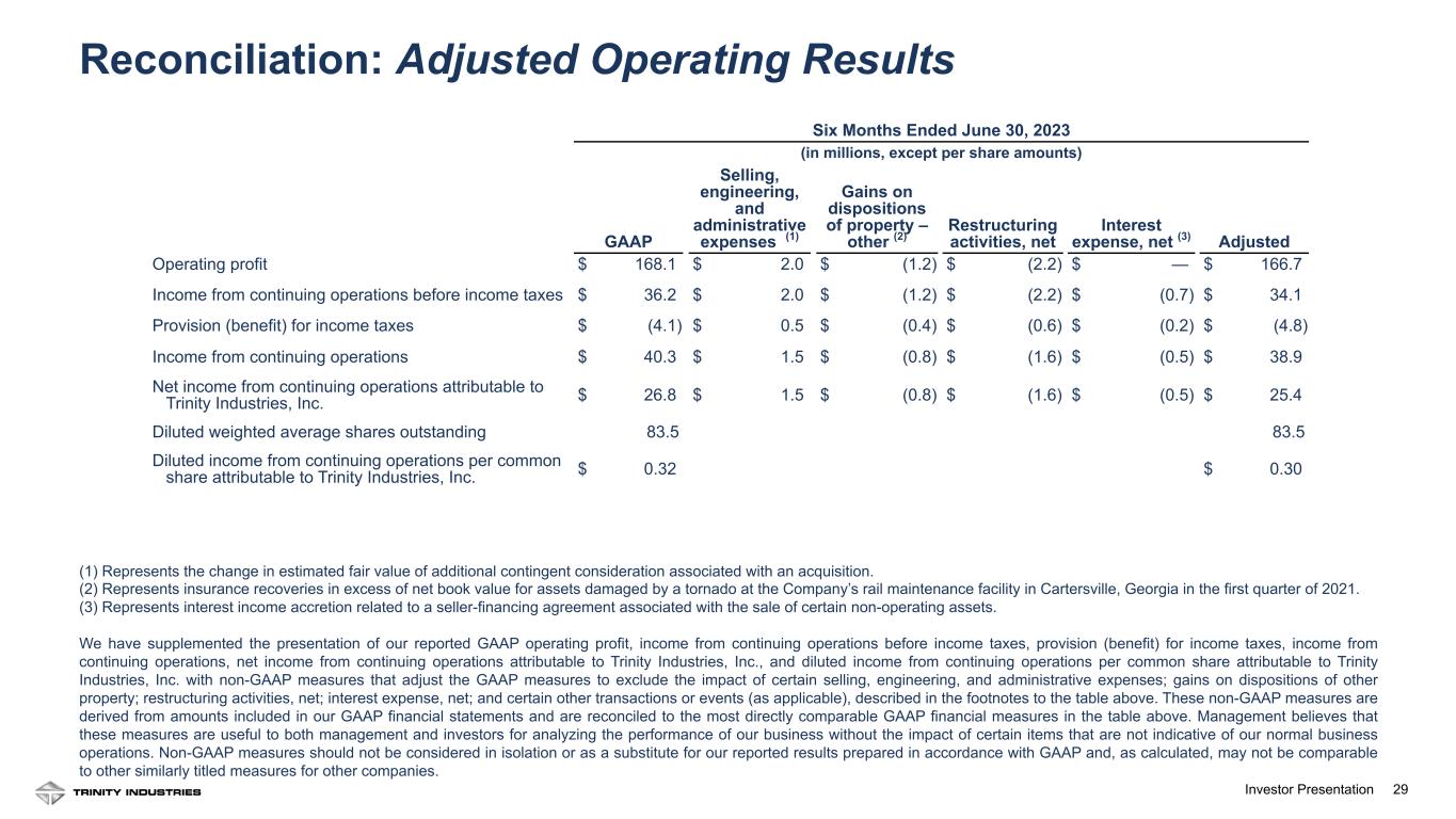 28Investor Presentation 28 Six Months Ended June 30, 2024 (in millions, except per share amounts) GAAP Interest expense, net (1) Adjusted Operating profit $ 257.1 $ — $ 257.1 Income from continuing operations before income taxes $ 117.9 $ (0.8) $ 117.1 Provision (benefit) for income taxes $ 28.1 $ (0.2) $ 27.9 Income from continuing operations $ 89.8 $ (0.6) $ 89.2 Net income from continuing operations attributable to Trinity Industries, Inc. $ 84.1 $ (0.6) $ 83.5 Diluted weighted average shares outstanding 83.4 83.4 Diluted income from continuing operations per common share attributable to Trinity Industries, Inc. $ 1.01 $ 1.00 (1) Represents interest income accretion related to a seller-financing agreement associated with the sale of certain non-operating assets. We have supplemented the presentation of our reported GAAP operating profit, income from continuing operations before income taxes, provision (benefit) for income taxes, income from continuing operations, net income from continuing operations attributable to Trinity Industries, Inc., and diluted income from continuing operations per common share attributable to Trinity Industries, Inc. with non-GAAP measures that adjust the GAAP measures to exclude the impact of certain interest expense, net; and certain other transactions or events (as applicable), described in the footnotes to the table above. These non-GAAP measures are derived from amounts included in our GAAP financial statements and are reconciled to the most directly comparable GAAP financial measures in the table above. Management believes that these measures are useful to both management and investors for analyzing the performance of our business without the impact of certain items that are not indicative of our normal business operations. Non-GAAP measures should not be considered in isolation or as a substitute for our reported results prepared in accordance with GAAP and, as calculated, may not be comparable to other similarly titled measures for other companies. Reconciliation: Adjusted Operating Results