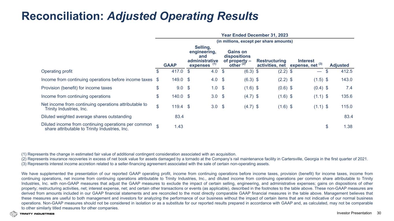 29Investor Presentation 29 Reconciliation: Adjusted Operating Results (1) Represents the change in estimated fair value of additional contingent consideration associated with an acquisition. (2) Represents insurance recoveries in excess of net book value for assets damaged by a tornado at the Company’s rail maintenance facility in Cartersville, Georgia in the first quarter of 2021. (3) Represents interest income accretion related to a seller-financing agreement associated with the sale of certain non-operating assets. We have supplemented the presentation of our reported GAAP operating profit, income from continuing operations before income taxes, provision (benefit) for income taxes, income from continuing operations, net income from continuing operations attributable to Trinity Industries, Inc., and diluted income from continuing operations per common share attributable to Trinity Industries, Inc. with non-GAAP measures that adjust the GAAP measures to exclude the impact of certain selling, engineering, and administrative expenses; gains on dispositions of other property; restructuring activities, net; interest expense, net; and certain other transactions or events (as applicable), described in the footnotes to the table above. These non-GAAP measures are derived from amounts included in our GAAP financial statements and are reconciled to the most directly comparable GAAP financial measures in the table above. Management believes that these measures are useful to both management and investors for analyzing the performance of our business without the impact of certain items that are not indicative of our normal business operations. Non-GAAP measures should not be considered in isolation or as a substitute for our reported results prepared in accordance with GAAP and, as calculated, may not be comparable to other similarly titled measures for other companies. Six Months Ended June 30, 2023 (in millions, except per share amounts) GAAP Selling, engineering, and administrative expenses (1) Gains on dispositions of property – other (2) Restructuring activities, net Interest expense, net (3) Adjusted Operating profit $ 168.1 $ 2.0 $ (1.2) $ (2.2) $ — $ 166.7 Income from continuing operations before income taxes $ 36.2 $ 2.0 $ (1.2) $ (2.2) $ (0.7) $ 34.1 Provision (benefit) for income taxes $ (4.1) $ 0.5 $ (0.4) $ (0.6) $ (0.2) $ (4.8) Income from continuing operations $ 40.3 $ 1.5 $ (0.8) $ (1.6) $ (0.5) $ 38.9 Net income from continuing operations attributable to Trinity Industries, Inc. $ 26.8 $ 1.5 $ (0.8) $ (1.6) $ (0.5) $ 25.4 Diluted weighted average shares outstanding 83.5 83.5 Diluted income from continuing operations per common share attributable to Trinity Industries, Inc. $ 0.32 $ 0.30